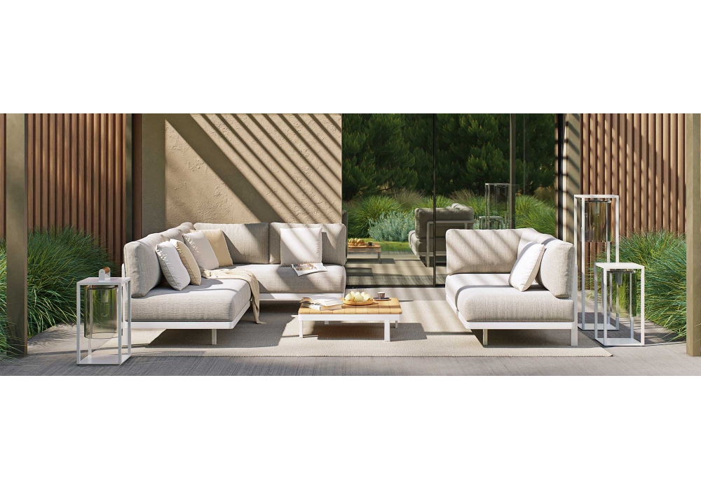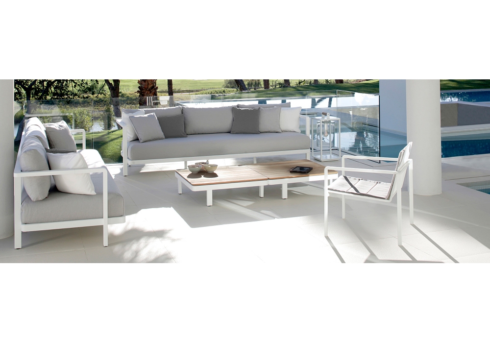 Alura Lounge designed and produced by Royal Botania is an outdoor armchair with aluminum structure in three finishes and cushions in different colours.