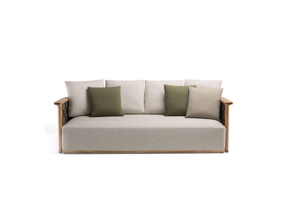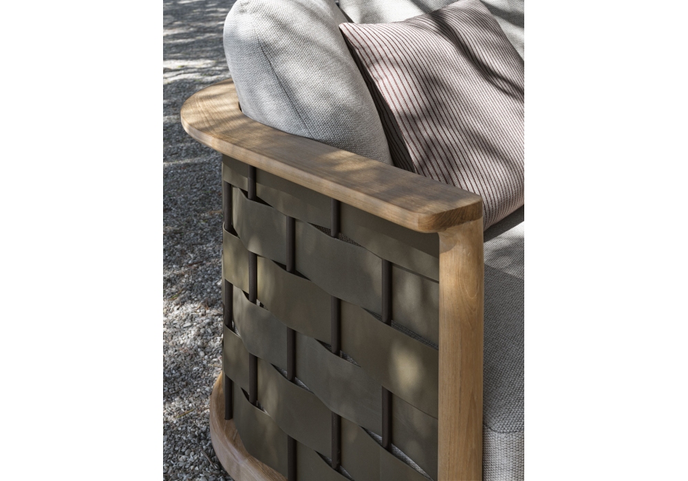 Palinfrasca designed by Vincent Van Duysen for Molteni&C is a sofa made with structure in solid teak, shell with woven bands in teak or in olive green polyurethane EVA. Polyurethane padding and fabric upholstery. Available in different models.