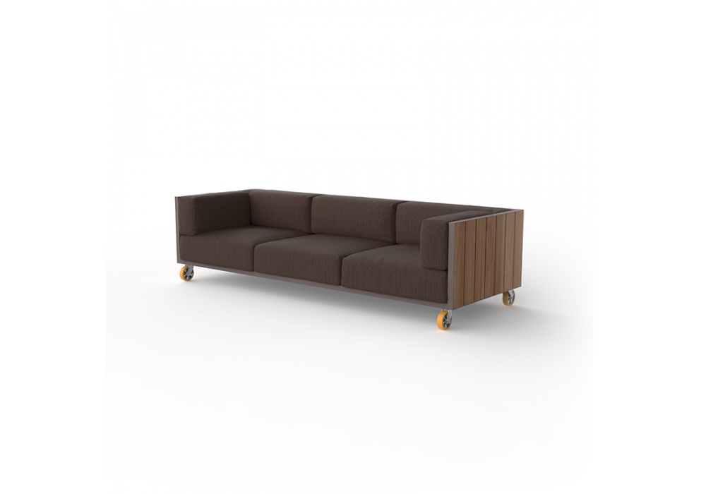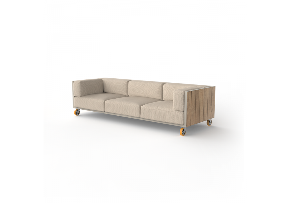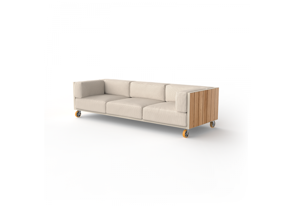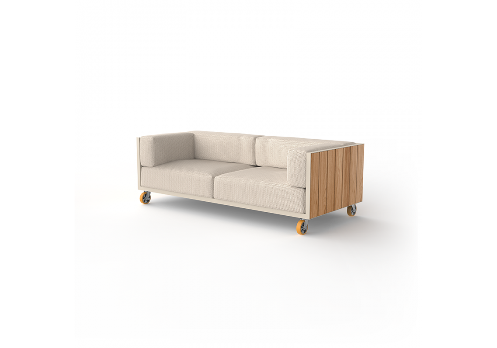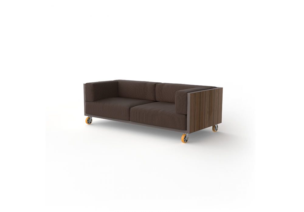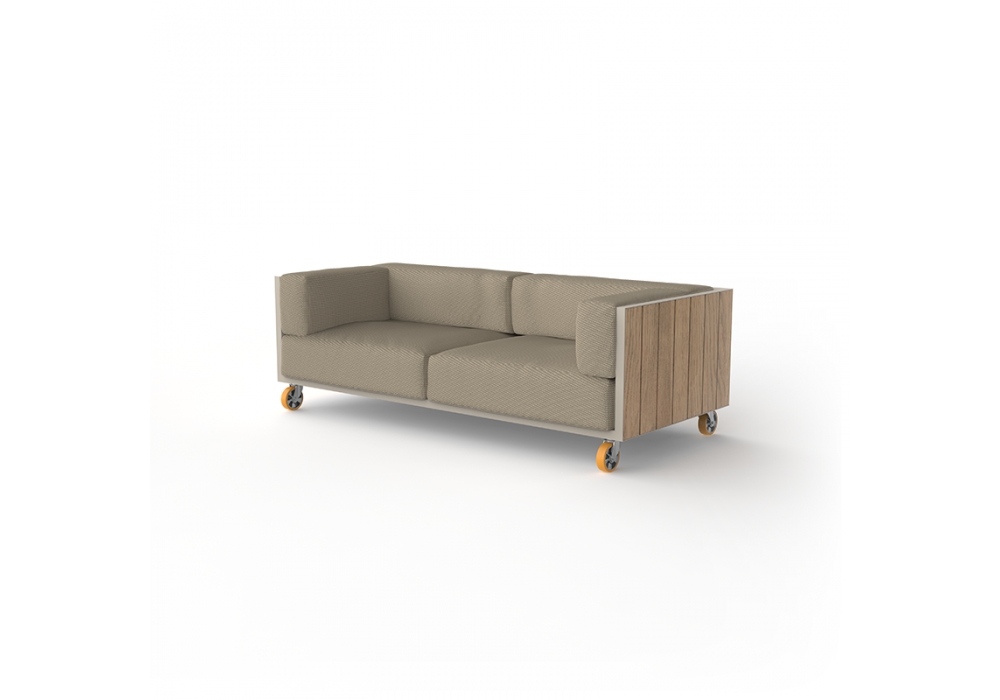 Vineyard designed by Ramón Esteve for Vondom is a sofa made with aluminum structure, wooden panels and padded cushions with fabric upholstery. Available with wheels or with legs.