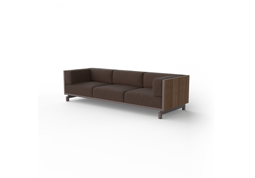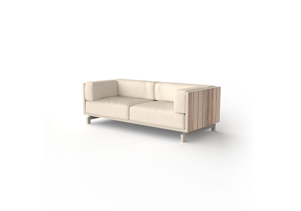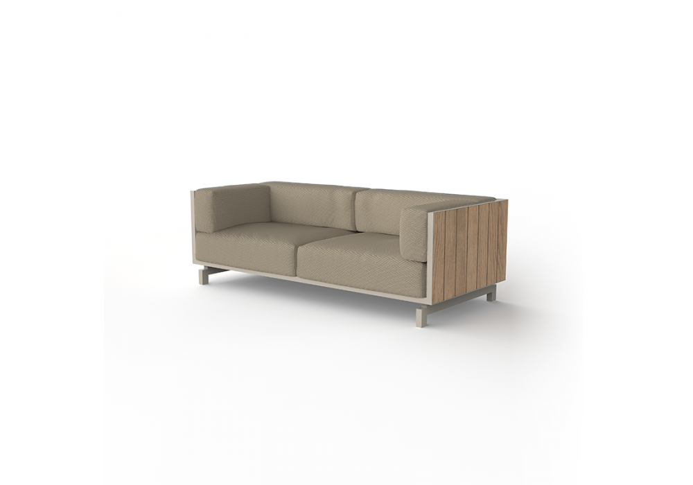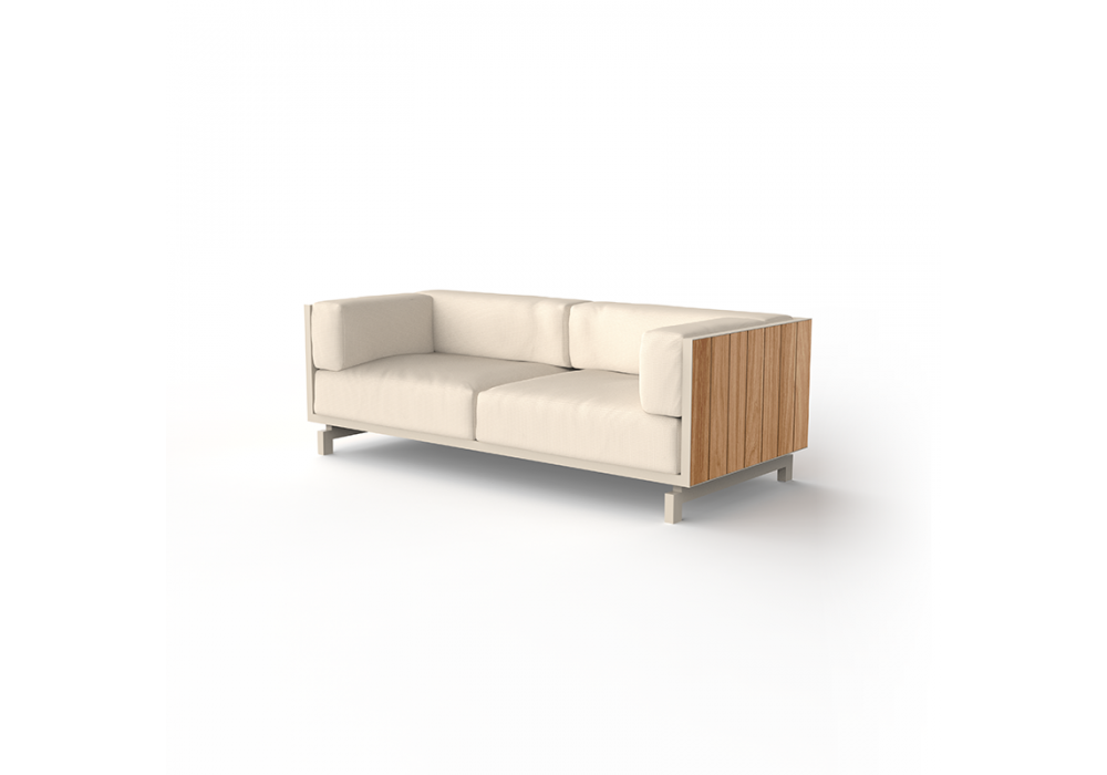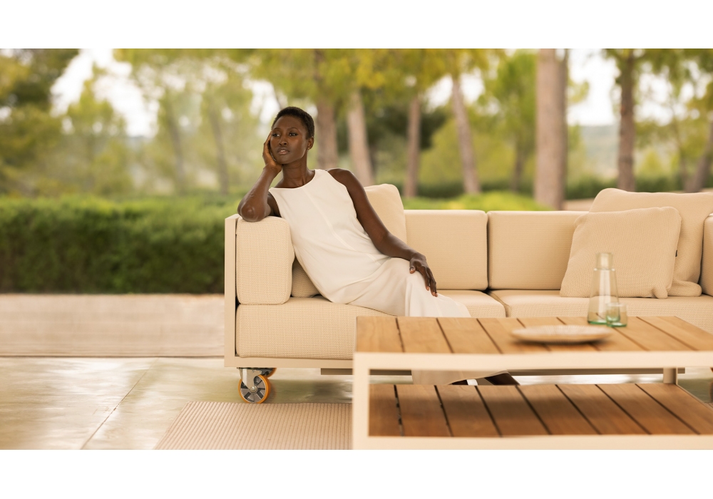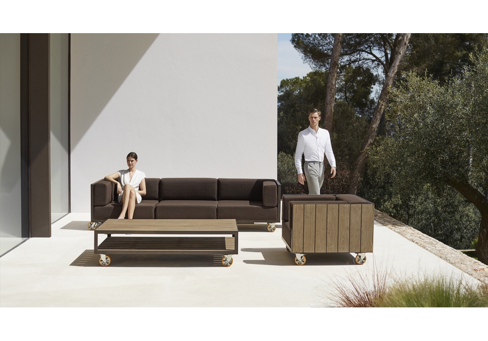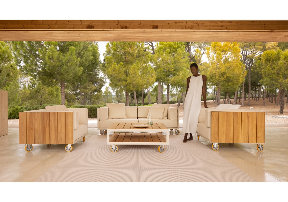 Vineyard designed by Ramón Esteve for Vondom is a sofa made with aluminum structure, wooden panels and padded cushions with fabric upholstery. Available with wheels or with legs.
