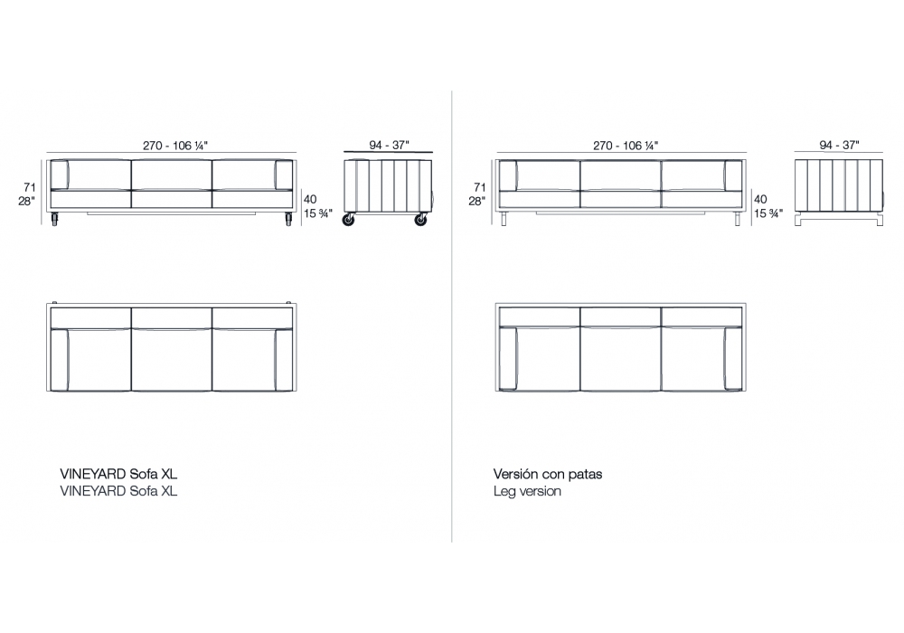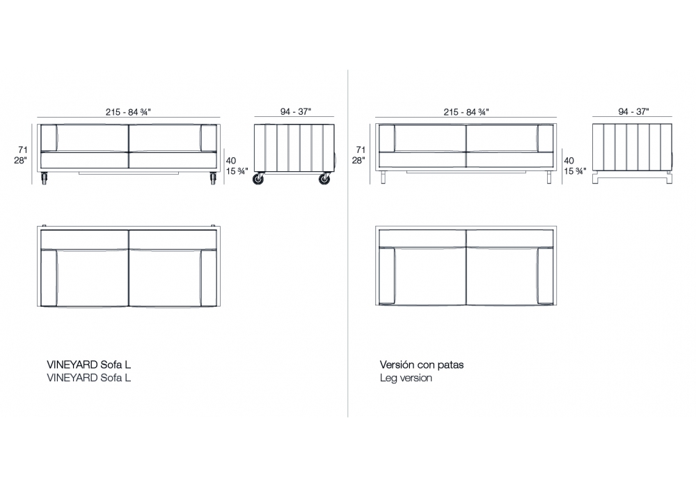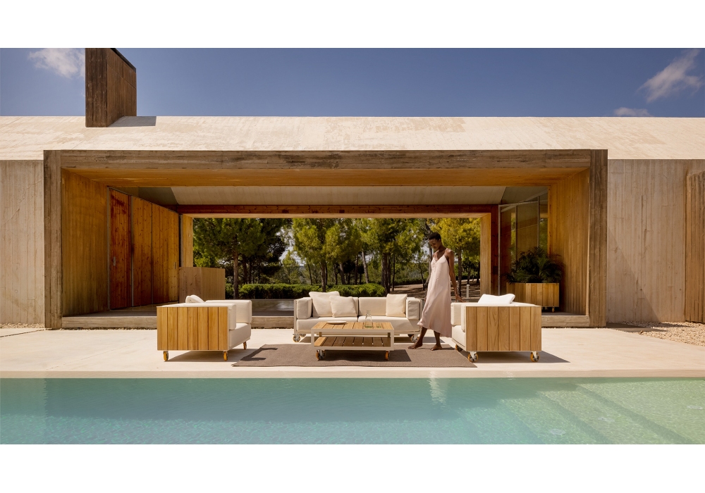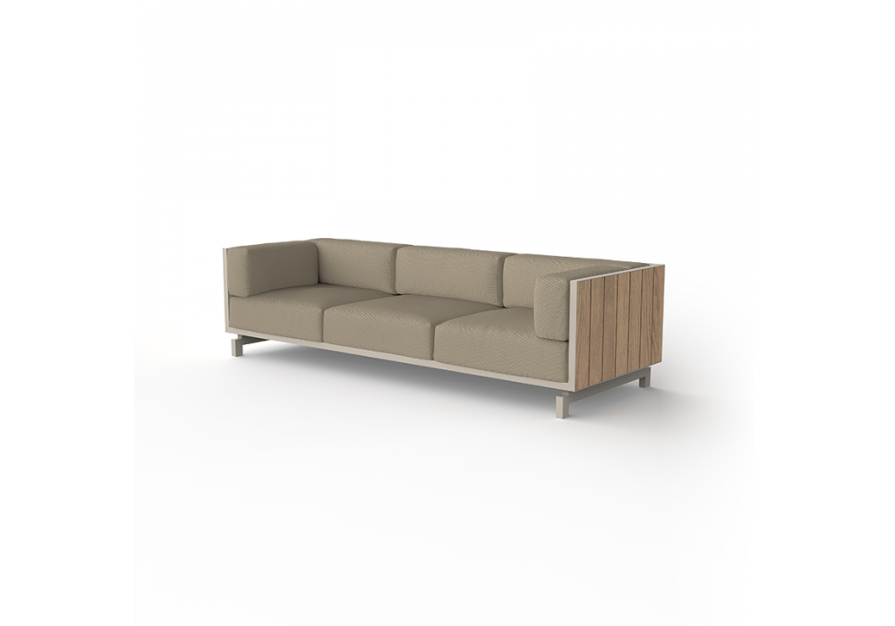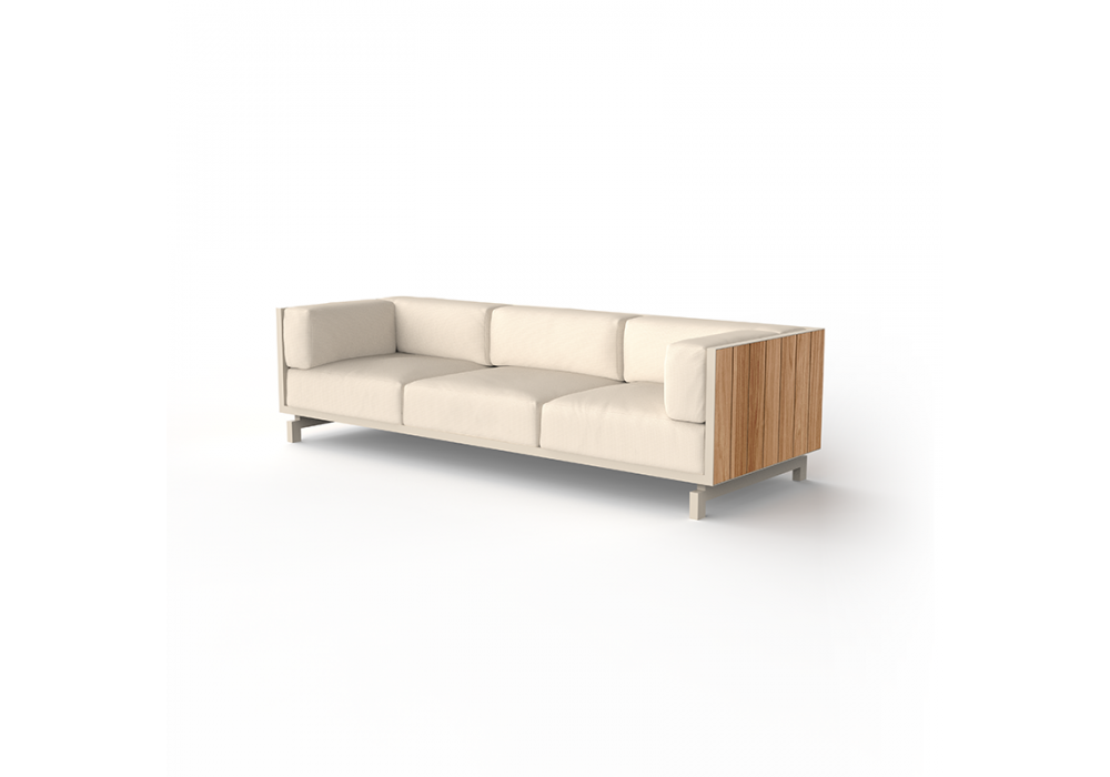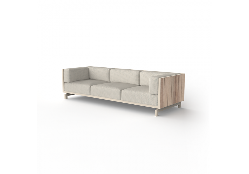 Vineyard designed by Ramón Esteve for Vondom is a sofa made with aluminum structure, wooden panels and padded cushions with fabric upholstery. Available with wheels or with legs.