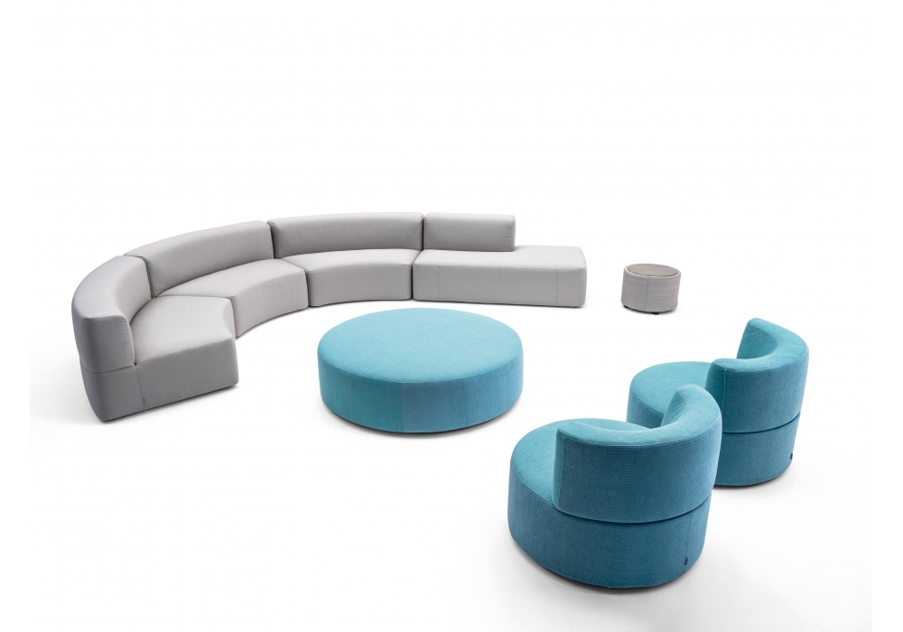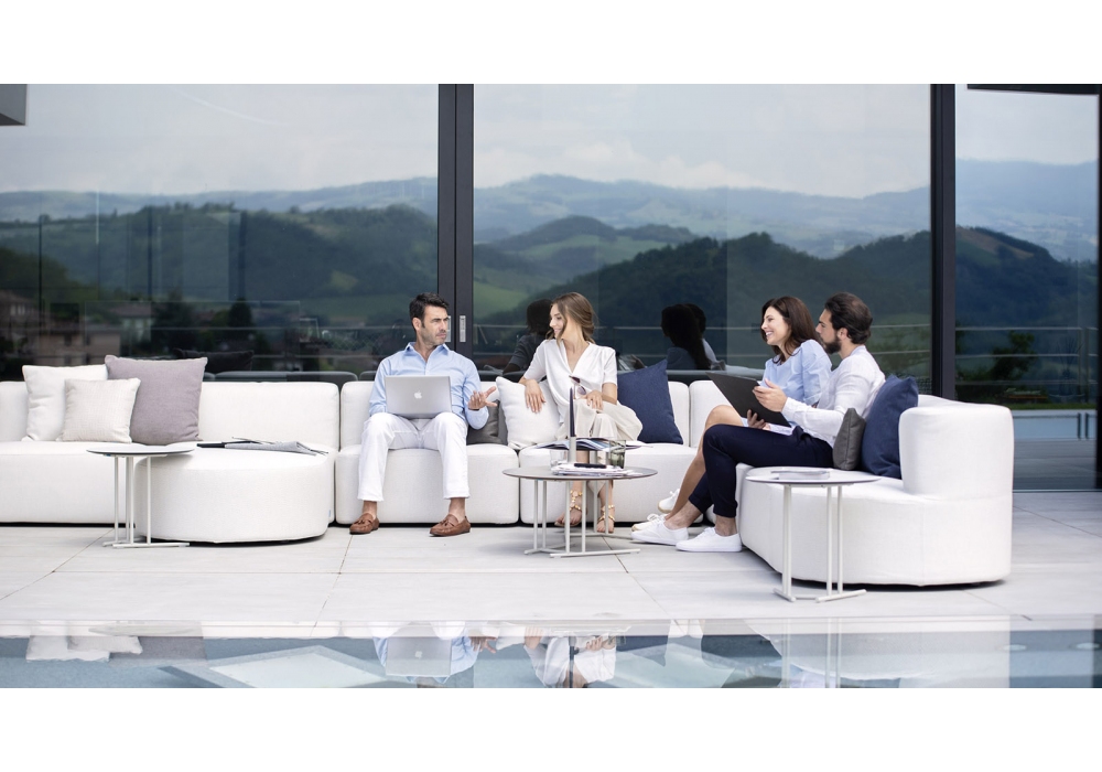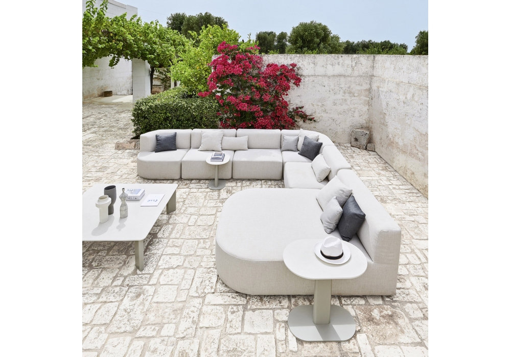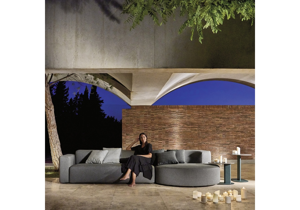 Belt designed by Daniele Lo Scalzo Moscheri for Varaschin is a modular sofa with supporting structure in solid okumè wood and padding with Dryfeel rubber for outdoor use. Available in different compositions and in the single-fabric or bi-fabric version with different colours.