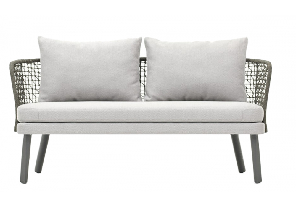 Emma designed by Monica Armani for Varaschin is an outdoor sofa with legs in aluminum or solid iroko. Seat upholstered in fabric with seat structure in polypropylene. Backrests with interwoven powder-coated aluminum frames or in plywood for outdoors and covered in fabric. Available in different finishes and in two sizes.