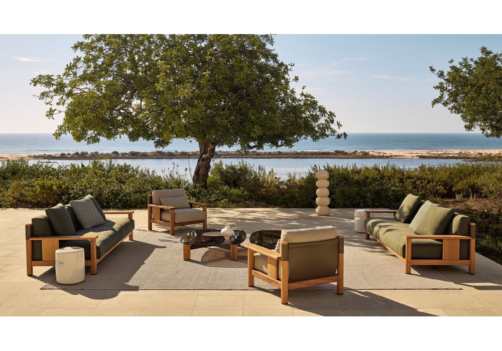 Ketch designed by Jean Marie Massaud for Poliform is a sofa with structure in solid natural iroko or black-stained iroko with back in color-stained EVA. Seat and back cushion in recycled PET polyester with polyurethane insert. Optional cushion in polyurethane. Pre-covering in polyester fiber with heat-sealed stitching. Decorative drawstring stitching with colored yarn. Removable cover in fabric.