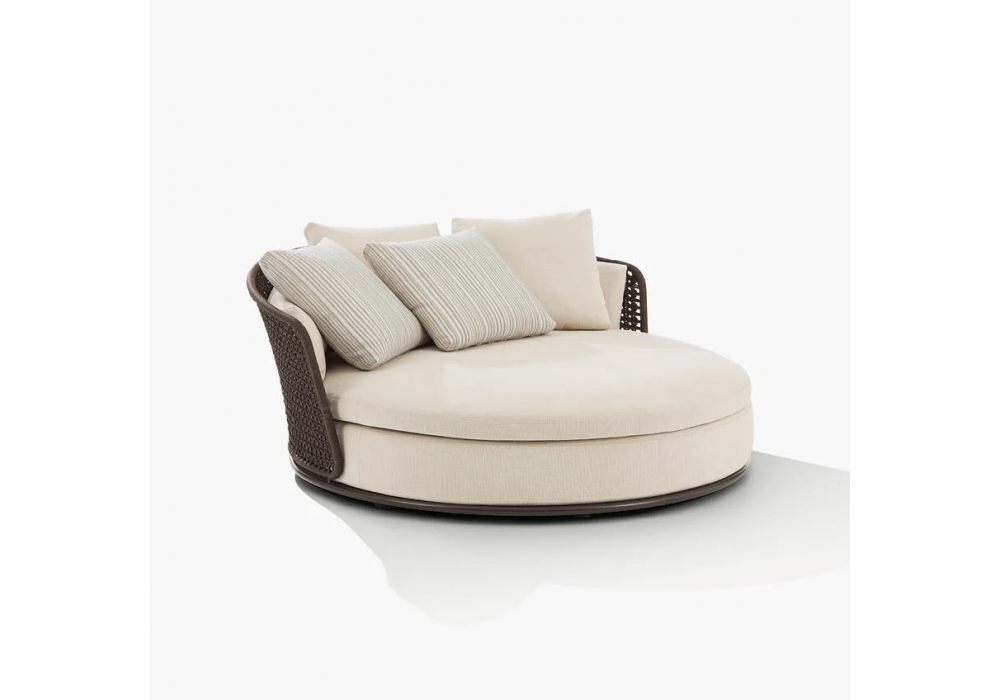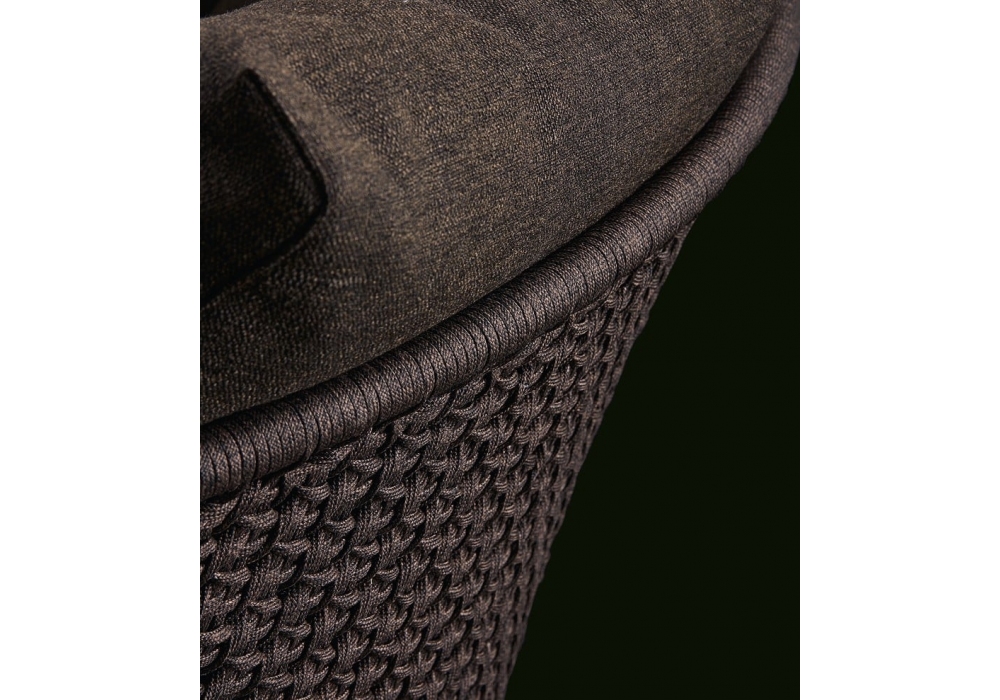 Soori designed by Soo Chan for Poliform is a daybed with backrest structure in tubular stainless steel covered in polypropylene tape and backrest in woven tape. Base in tubular stainless steel painted matt brown. Feet in thermoplastic material. Seat cushion in molded flexible polyurethane. Back and comfort cushions in recycled PET polyester. Pre-covering in polyester fiber with heat-sealed stitching. Removable cover in fabric.