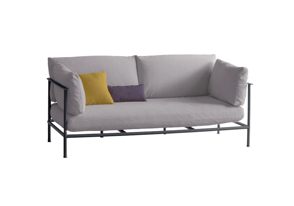 Elodie Outdoor designed by Chiara Andreatti for Potocco is an outdoor sofa with structure in embossed painted tubular metal in different finishes. Seat and backrest are padded with fireproof polyurethane foam and upholstered in various fabrics.