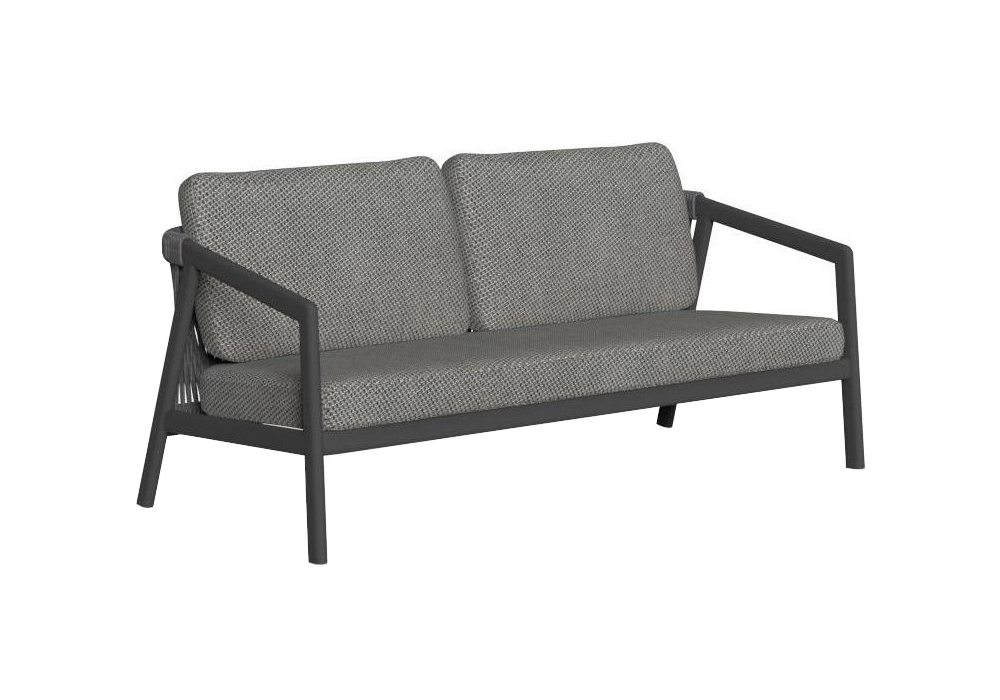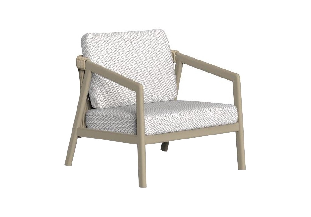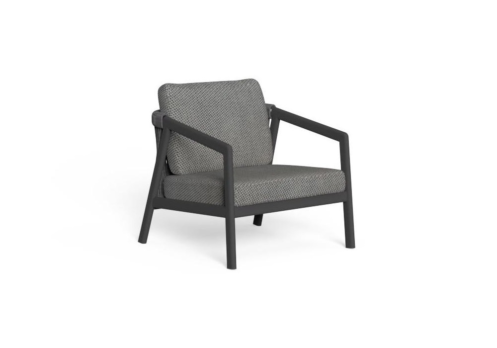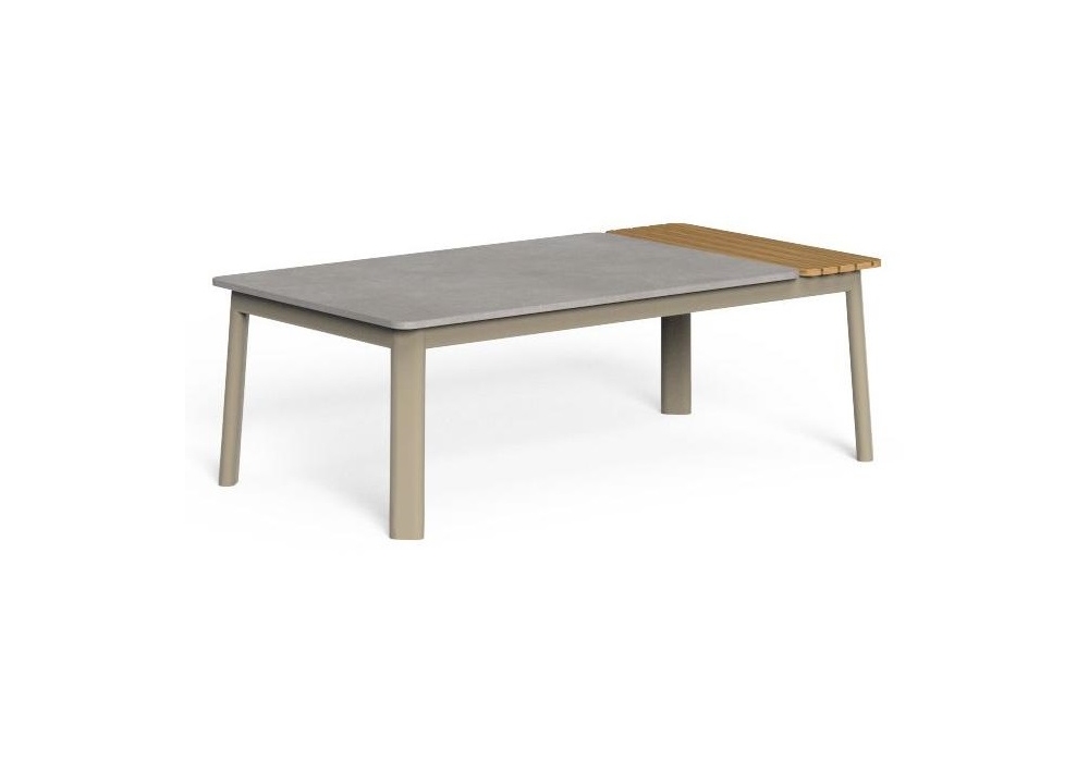Nova designed by Talenti is a set consisting of a sofa, two armchairs and a coffee table. The coffee table has an aluminum structure and stoneware and wood top, aluminum sofa and armchairs and fabric covering. Available in different finishes.
