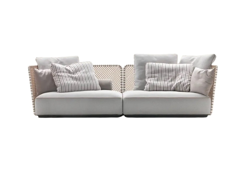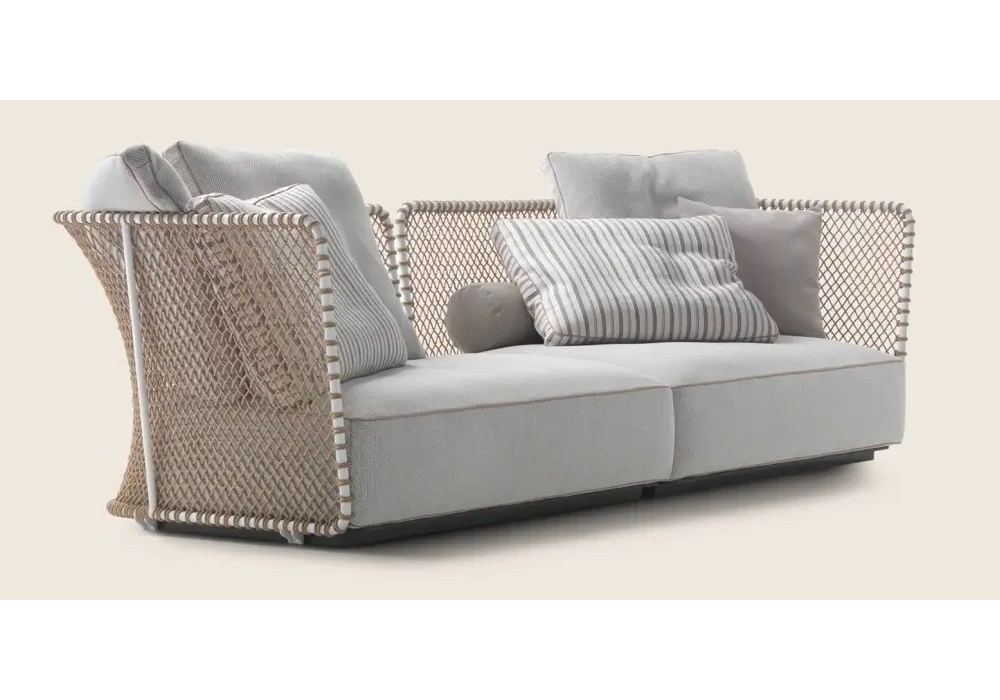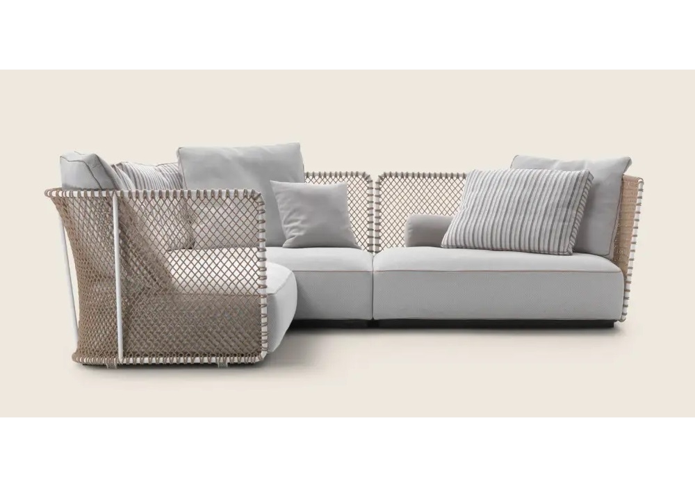 Oasis designed by Antonio Citterio for Flexform is an outdoor modular sofa with structure in tubular stainless steel painted with epoxy powders. PVC or cord weave, available in various finishes. Base in black painted stainless steel and layered compact laminate panel. Removable upholstery in different fabrics. With its sinuous and enveloping lines, the Oasis seating system allows you to design furnishing solutions for outdoor spaces that evoke an intimate and intimate atmosphere.