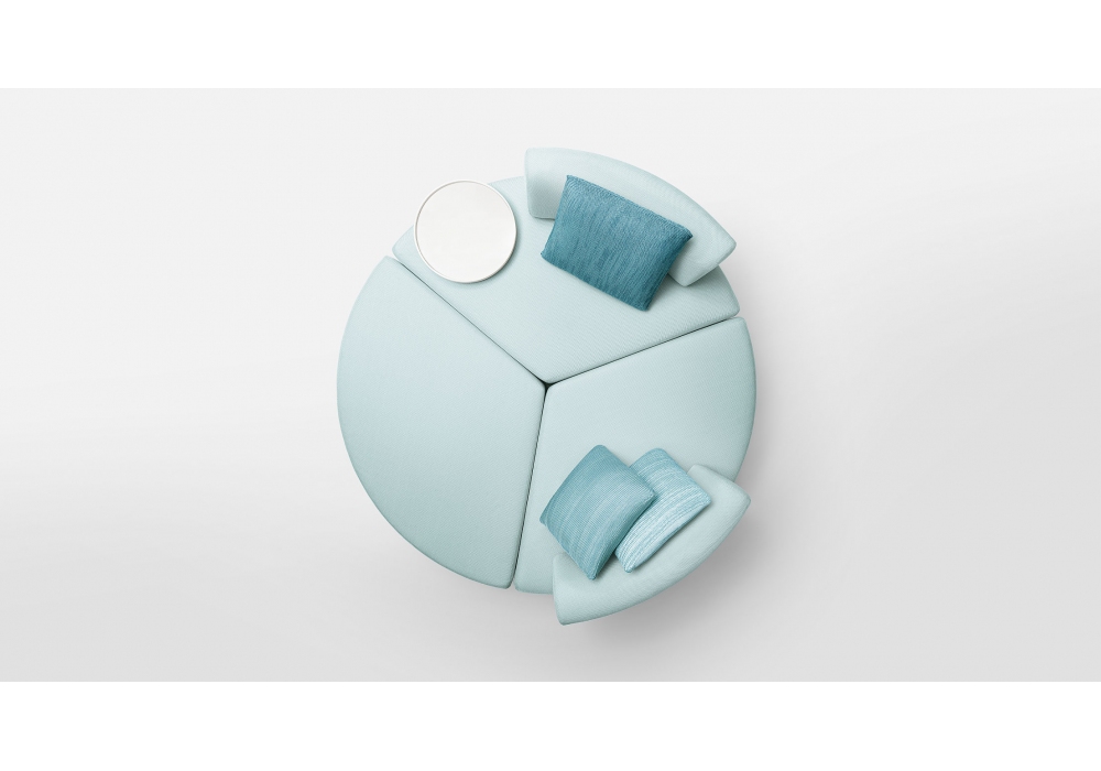 Elianto designed by Espen Øino for Paola Lenti is a circular-shaped sofa with tubular structure and matt painted stainless steel mesh, adjustable feet in plastic material. Removable fabric covering available in different finishes. The platform is completed by two backrests and a swivel table attached to the structure.
