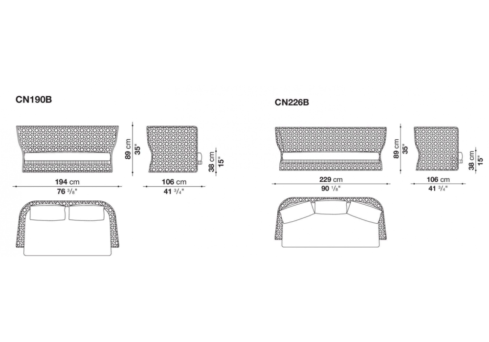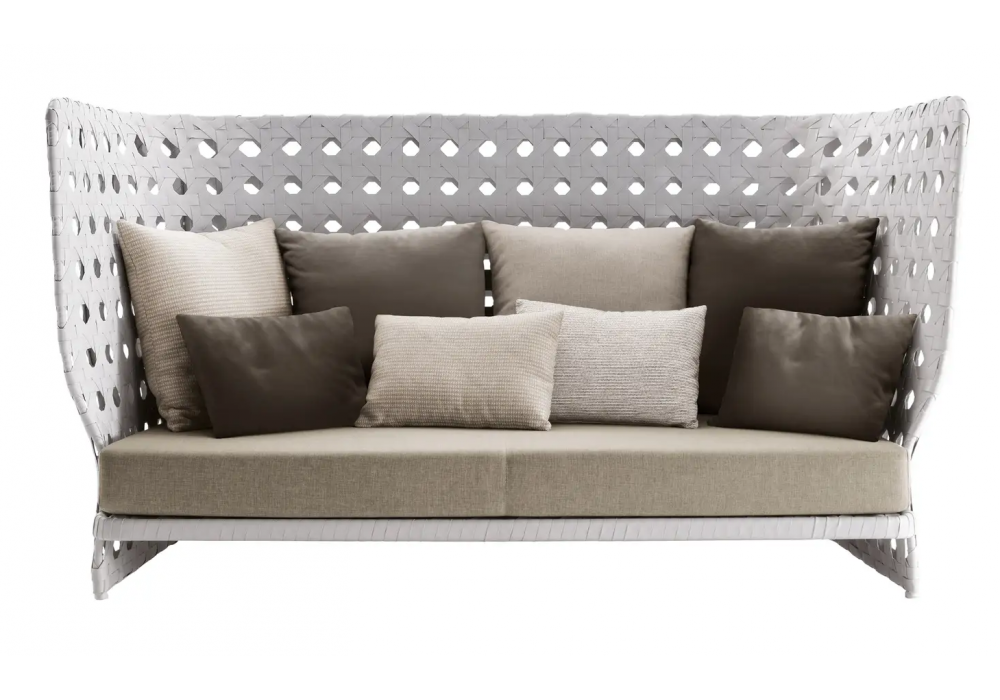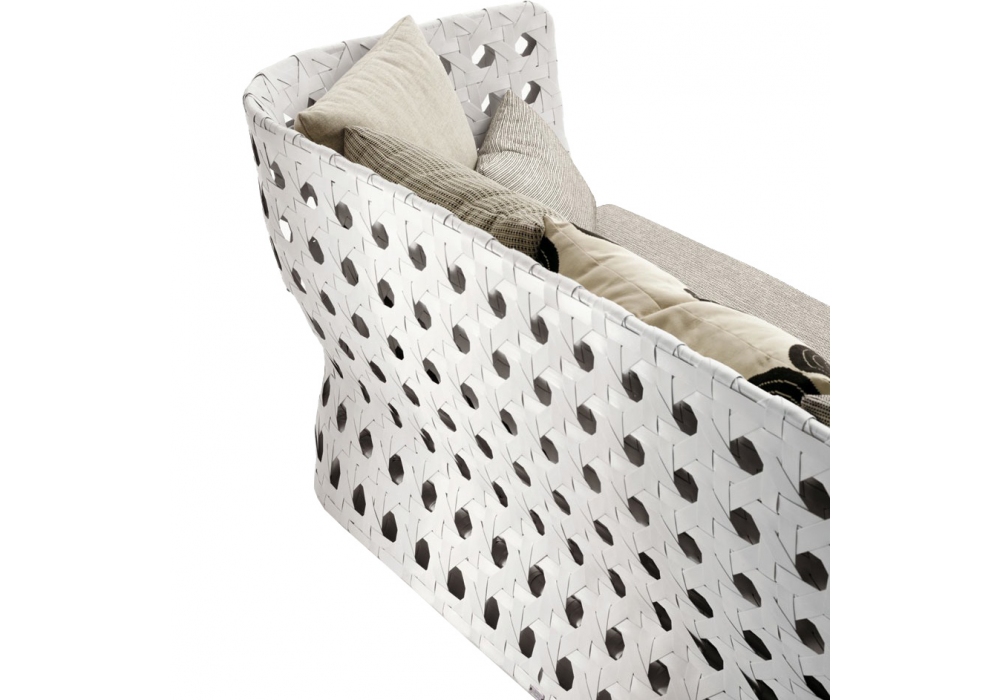 Canasta designed by Patricia Urquiola for B&B Italia Outdoor is a sofa with a white painted aluminum frame and white polyethylene fiber weave. Upholstery in different fabrics. Available in different dimensions.