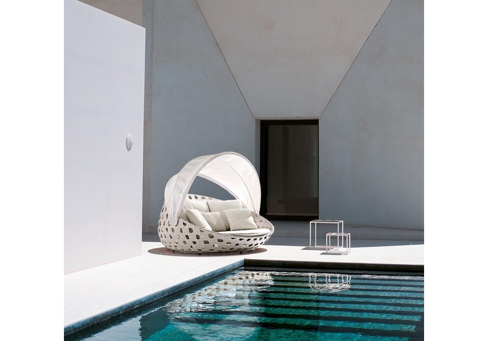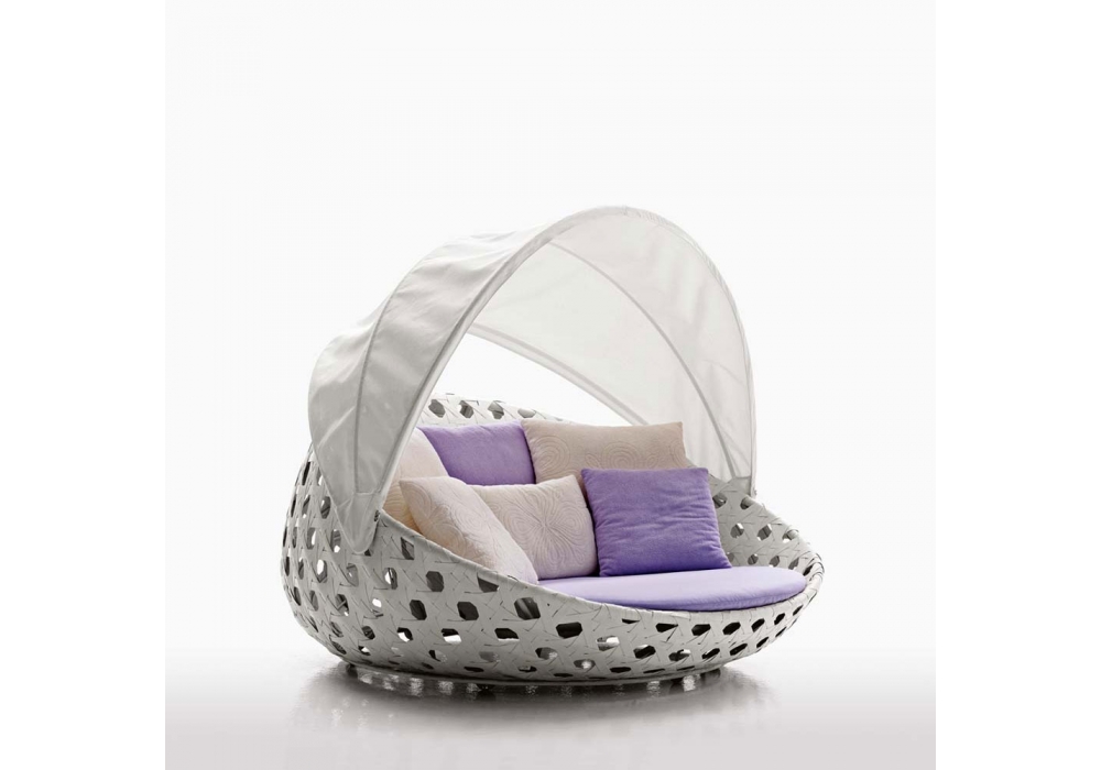 Canasta designed by Patricia Urquiola for B&B Italia Outdoor is a sofa with structure in white polyester powder painted aluminium and interlacing in white polyethylene. Seat cushion in shaped polyurethane and back cushion in polyester fibre, cover in water repellent polyester fibre. Covering in fabric. Available with canopy in painted glass fibre and covering in Batik bianco.