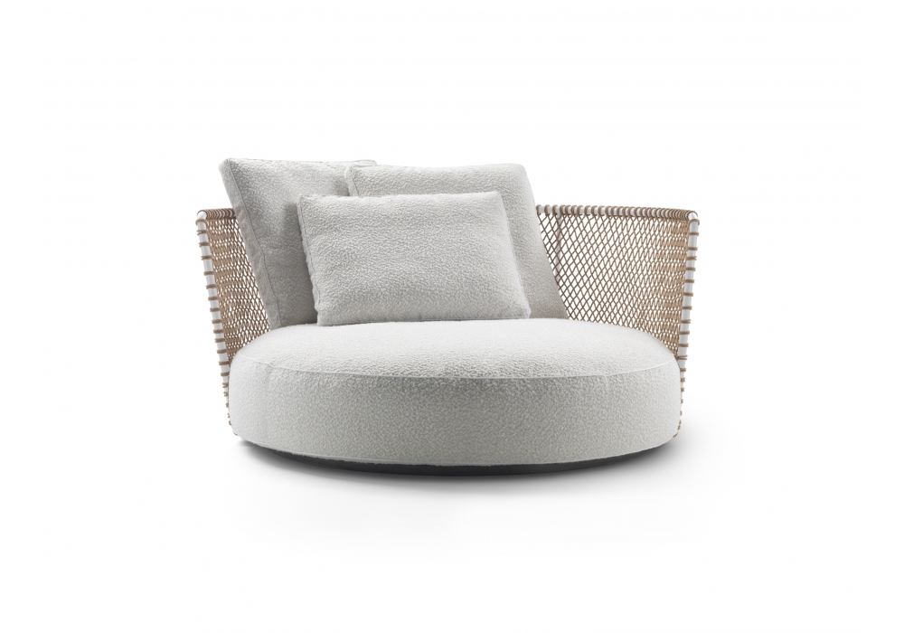 Oasis designed by Antonio Citterio for Flexform is a linear outdoor circular sofa with a tubular structure in oven-painted stainless steel, cushions in polyurethane and polyester fiber covered in protective fabric. Grosgrain profile. Removable fabrics. Available in different sizes and finishes.