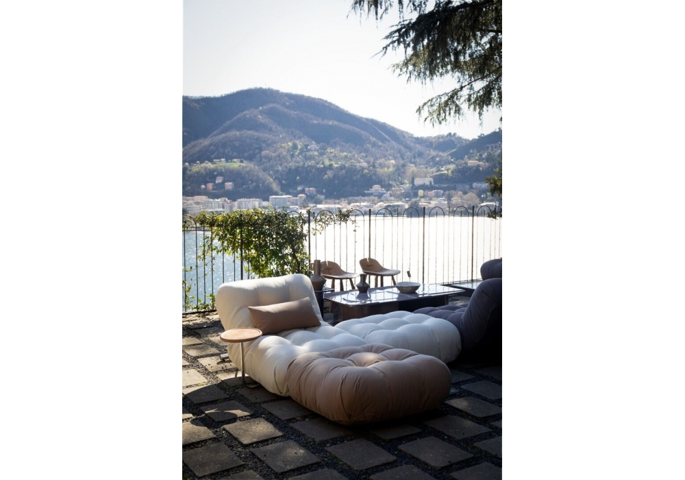 Eileen Outdoor designed by Baxter P. is a modular sofa iwith a polished 316 stainless steel or satin brass frame and padding in differentiated density polyurethane foam. Side table in solid sandblasted iroko with oil finish with a choice of finish. Removable cover.