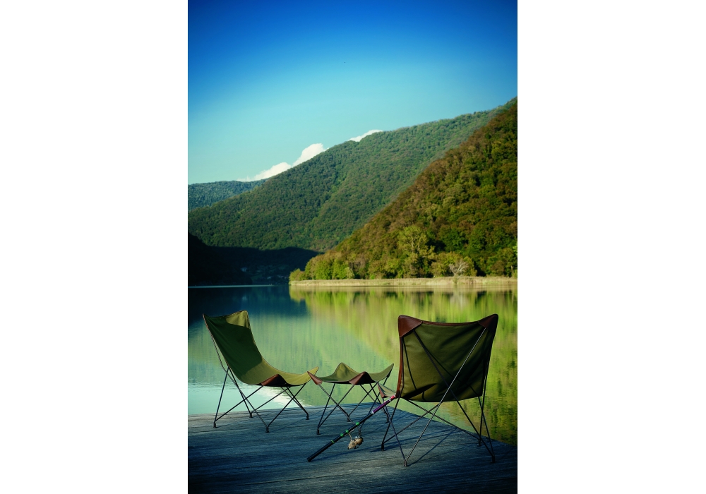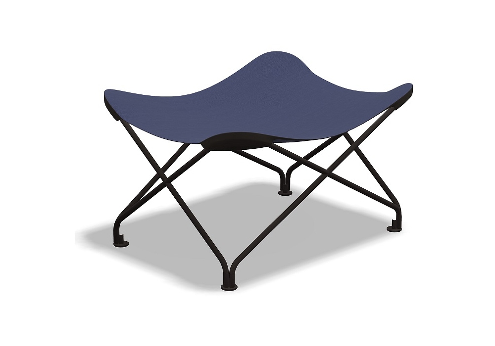 Lawrence is an outdoor stool designed by Rodolfo Dordoni for Roda. Essential design for Lawrence: a cotton impermeable canvas with leather inserts, clothes the vertexes of four structural triangles in metal wire. Available in sand, green or blue canvas, it is perfect both for indoor and outdoor spaces.