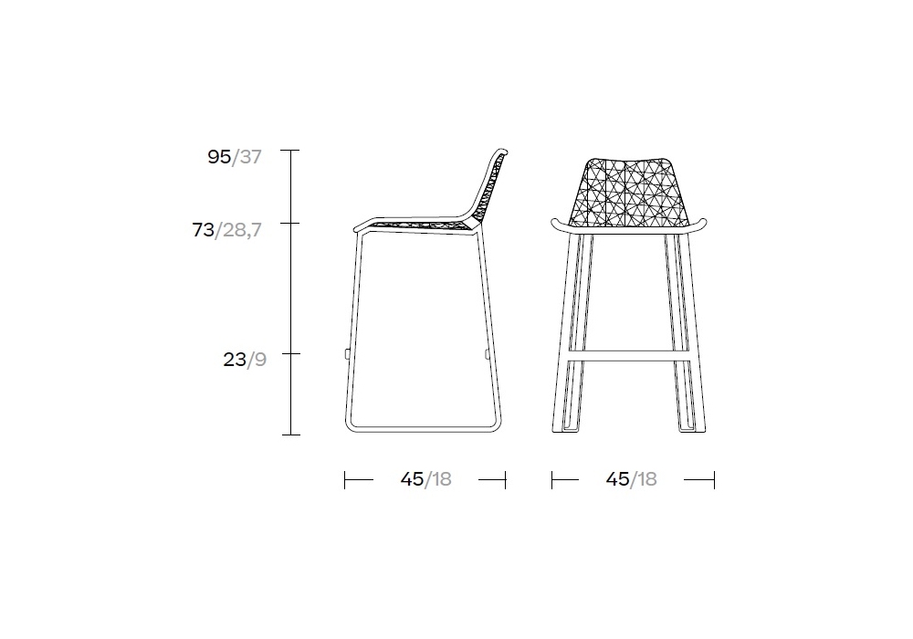 Maia designed by Patricia Urquiola for Kettal is a bar stool with shell and structure in painted aluminum. The shell is in aluminum covered in synthetic fiber or rope. The cushion is padded and covered in fabric suitable for outdoor use. Maia is available in different finishes.