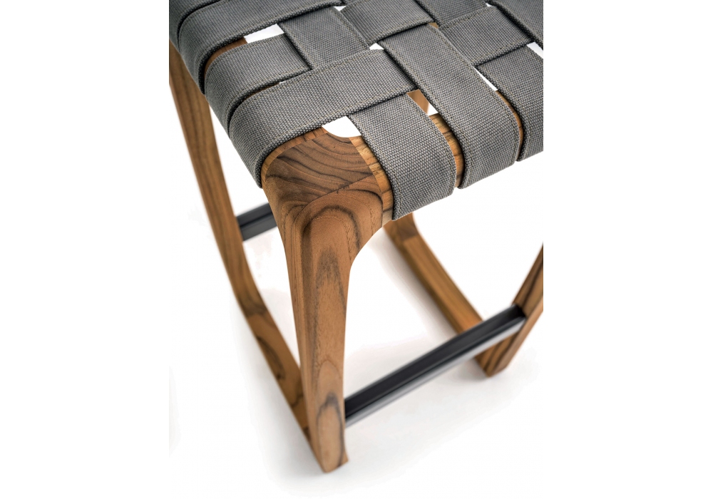 Bungalow Outdoor designed by Jamie Durie for Riva 1920 is a bar stool with structure in solid teak wood completely turned, assembled and sanded by hand, equipped with a practical iron footrest. The seat is characterized by an interweaving of outdoor fabric strings.