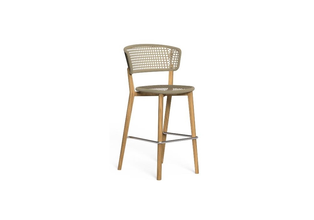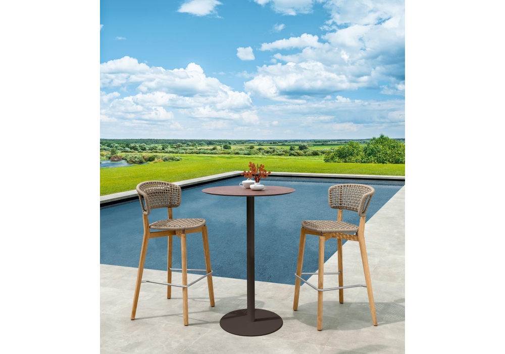 Moon Teak designed by Cristian Visentin for Talenti is a stool with seat and backrest in rope and structure in teak.