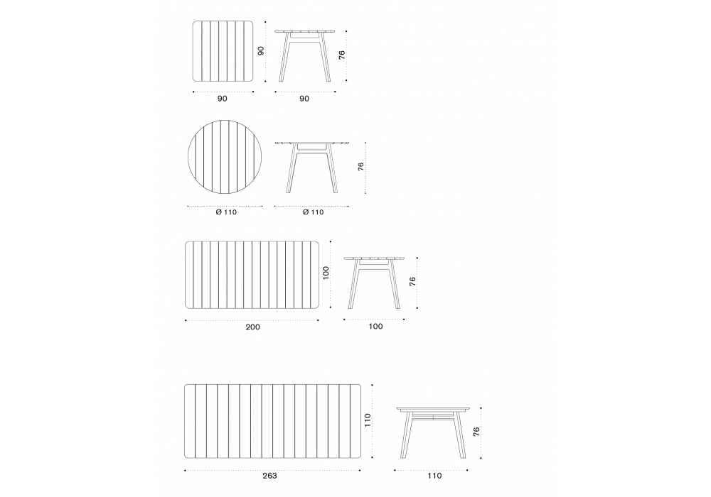 | Dimensions | 90 x 90 x H 76 cm; Ø 110 x H 76 cm; 200 x 100 x H 76 cm; 263 x 110 x H 76 cm. |