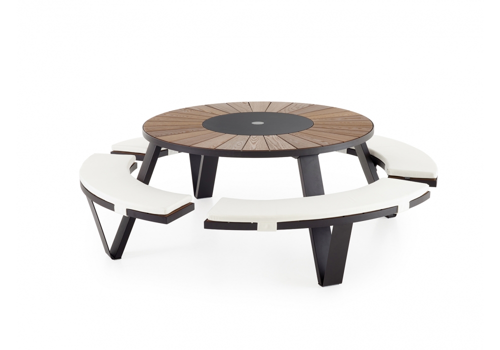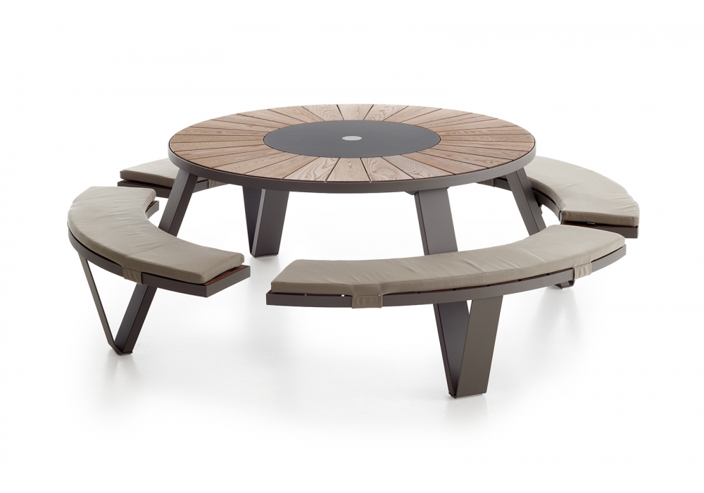Pantagruel Picnic designed by Dirk Wynants for Extremis is a picnic table realized with steel and wood. The structure comes powder coated or galvanised, and there are several material options for the fixed benches and tabletop. It also features a Lazy Susan to easily pass through things.