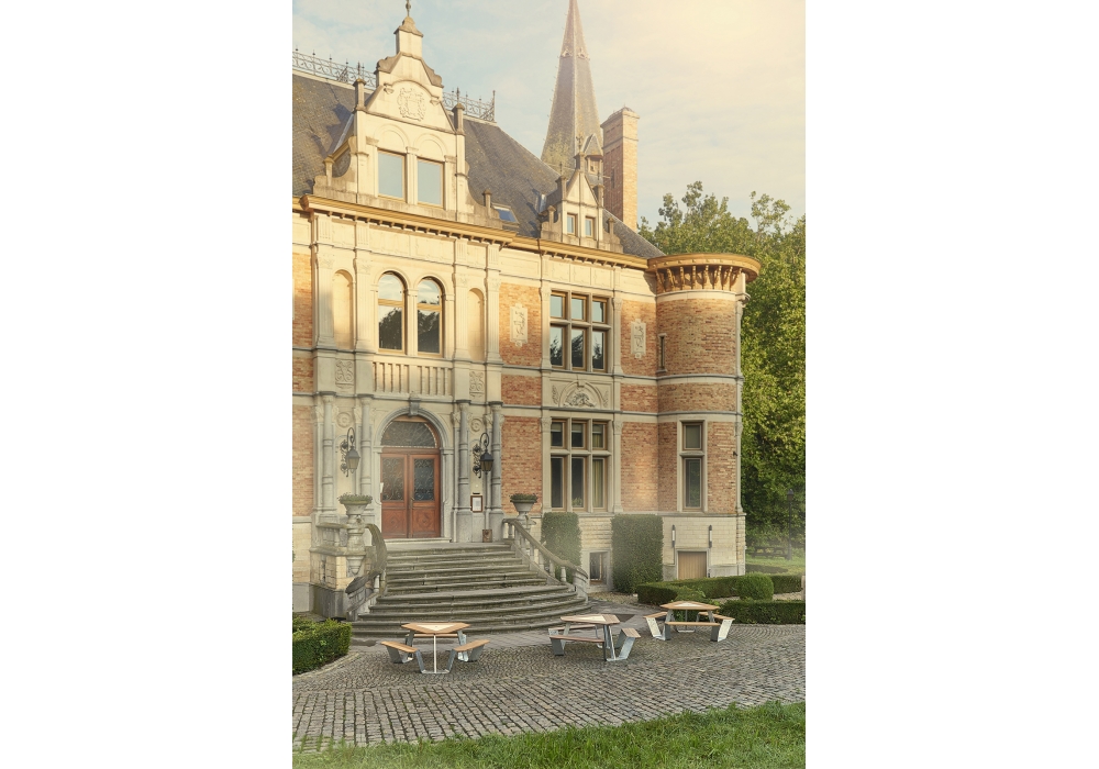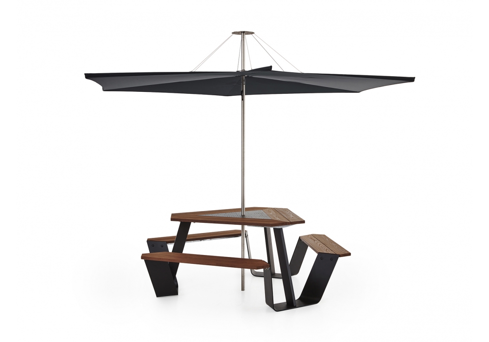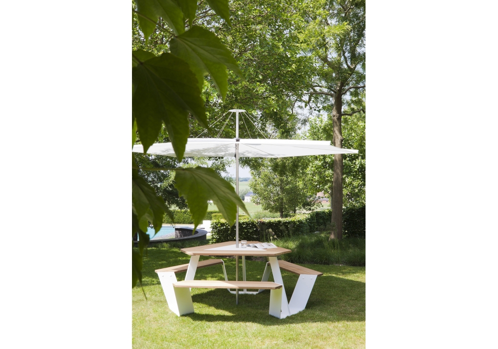 Anker designed by Dirk Wynants for Extremis is a table for picnic with steel structure and wooden top. In combination with the Inumbrina sunshade it’s an awesome eye-catching set up. Get creative with the different colours of wood and steel to make your favourite combination that suits your way of life.