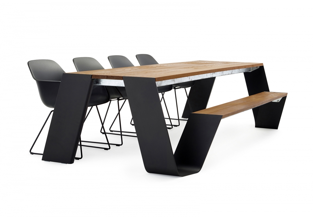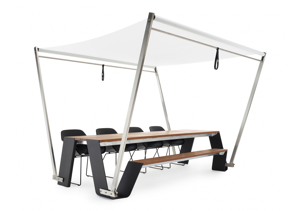 Hopper Combo designed by Dirk Wynants for Extremis is a table with metal structure and wooden top. The two access points allow you to sit down far more elegantly than if you had to swing your legs over the bench. From now on you can opt to replace one or both benches with chairs. This table is perfect to combine with "Hopper Shade". Available in different dimensions. On request the backrest and parasol.