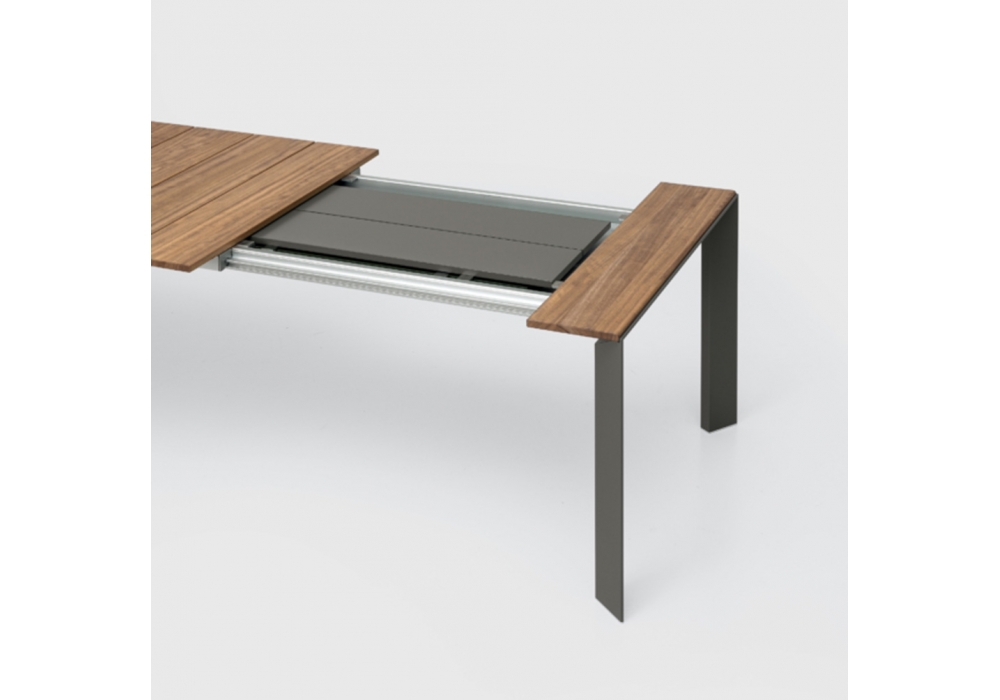 Nori Slatted designed by Bartoli Design for Kristalia is an extensible outdoor table with aluminum legs. Teak top. Available in various dimensions. Aluminum extensions in the same finish as the legs.