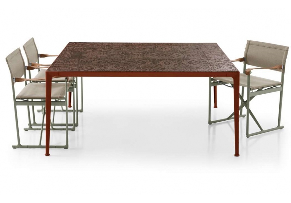 Mirto designed by Antonio Citterio for B&B Italia Outdoor is a table with a painted aluminum structure and a lava stone top with decoration in different finishes.