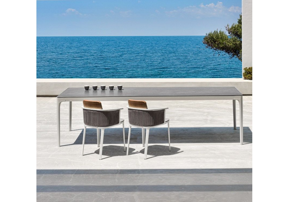 Play produced and designed by Ethimo is an outdoor dining table with painted aluminum structure and top in teak, aluminum or ceramic stone. Play is available in different sizes and finishes.