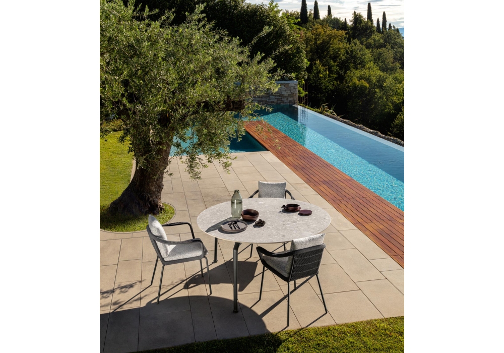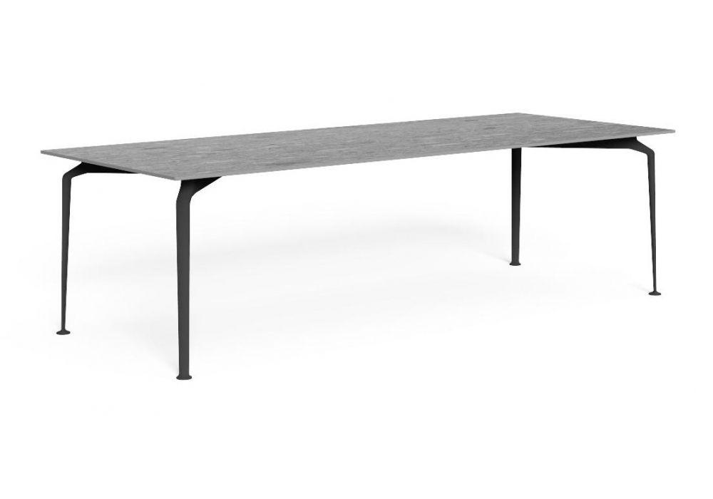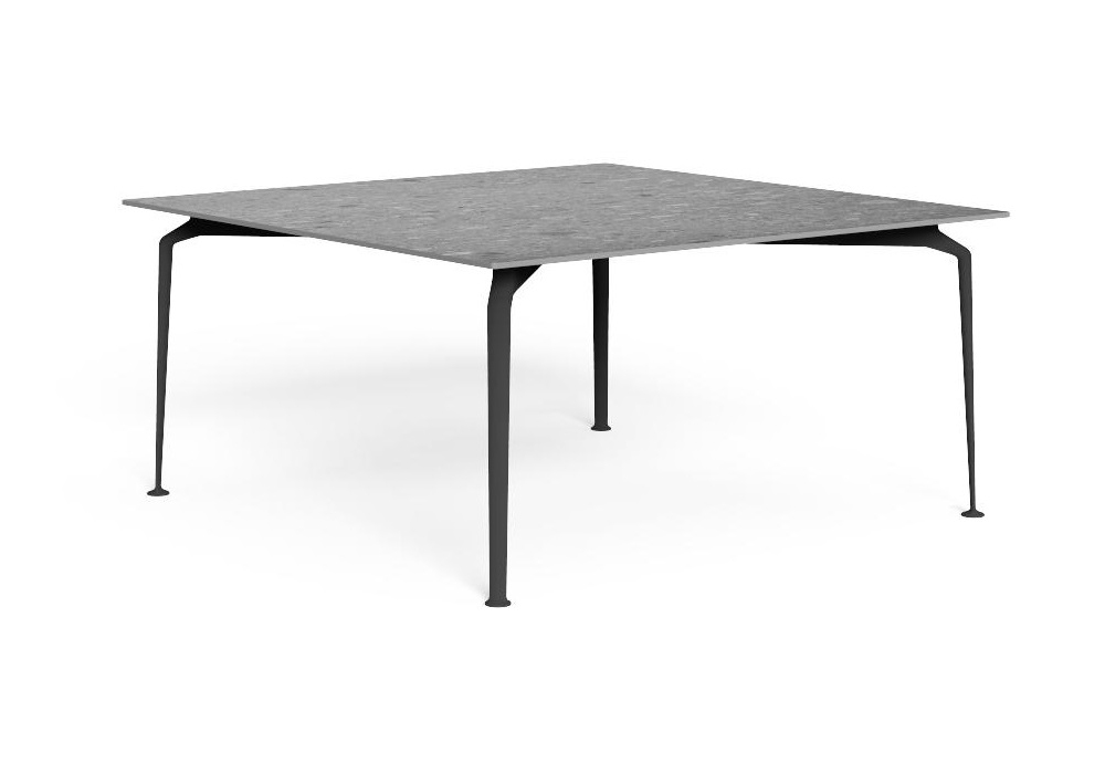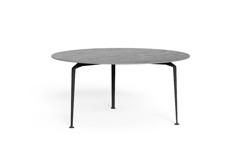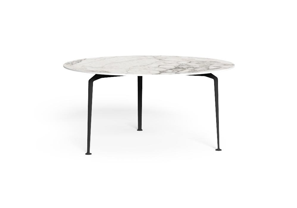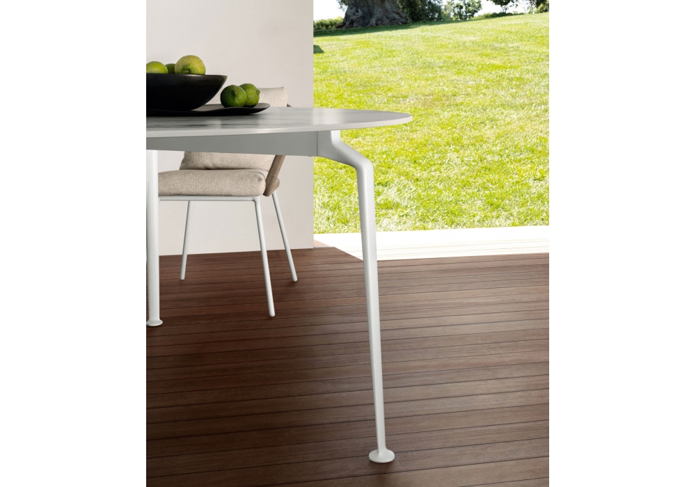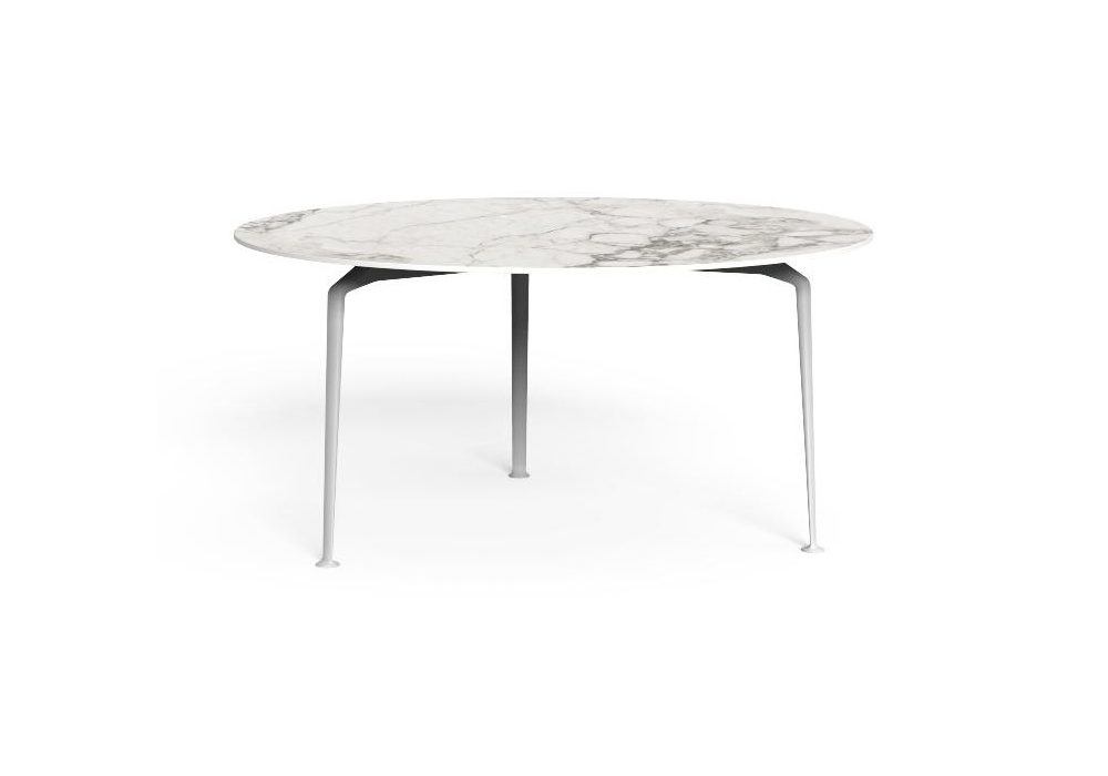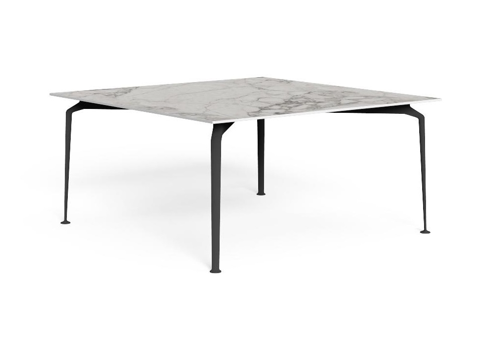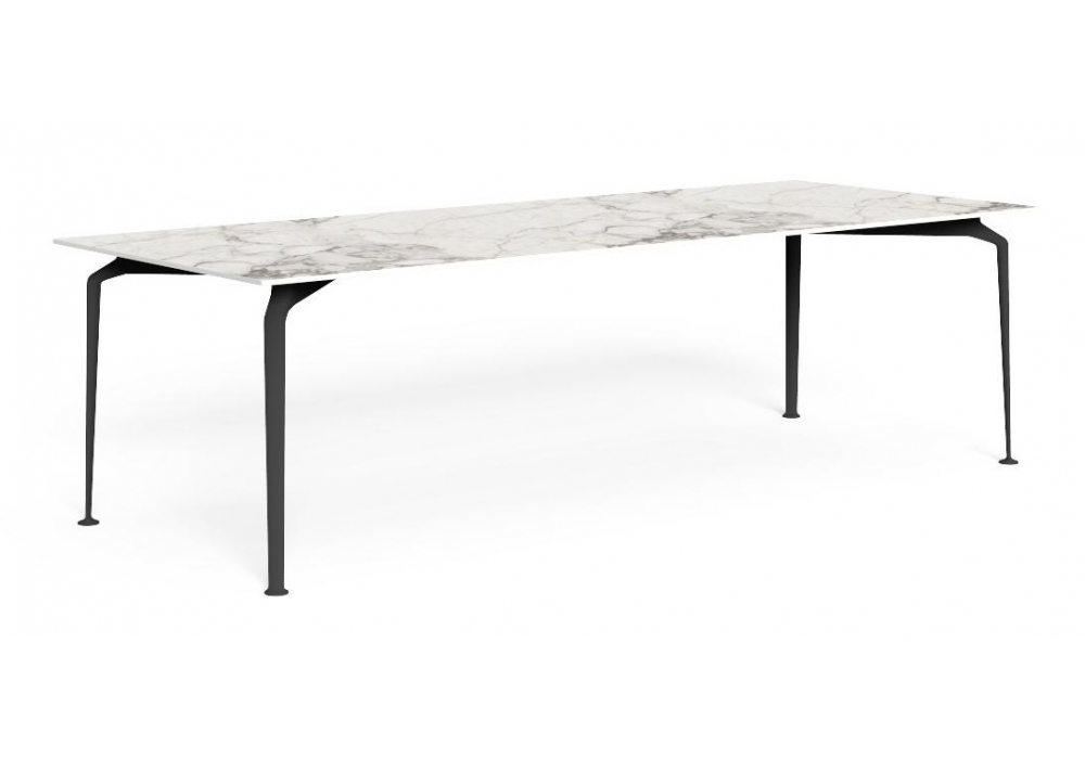 Cruise Alu designed by Ludovica and Roberto Palomba for Talenti is a table with aluminum structure in three finishes, white, graphite or aqua green and stoneware top in the 12 mm calacatta finish. Available in three different sizes.