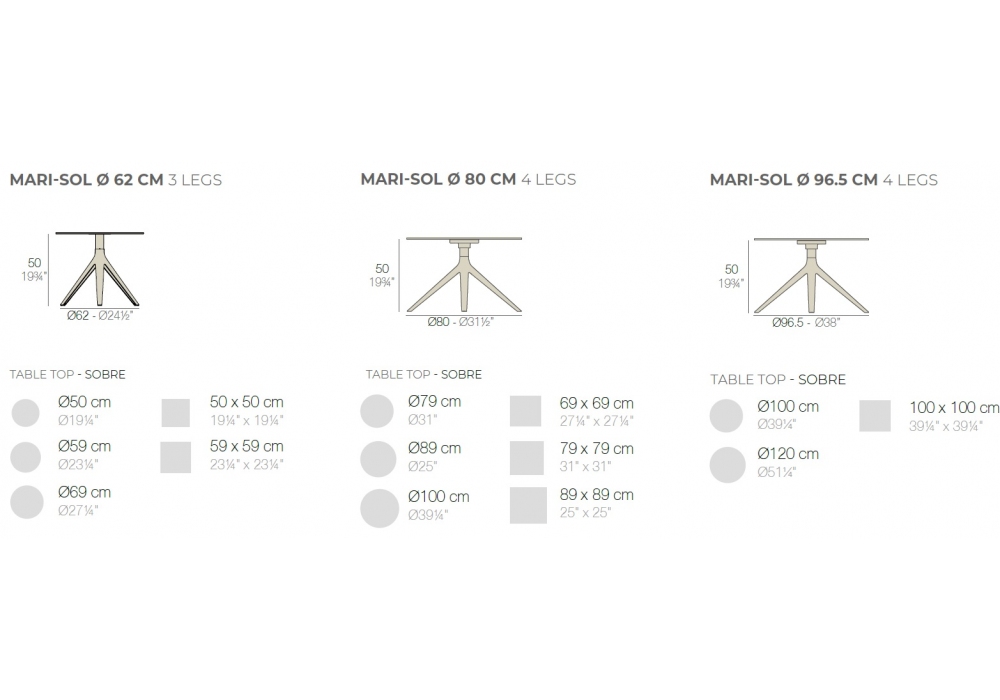 | Base | Ø 62 x H 50 cm; Ø 80 x H 50 cm; Ø 96.5 x H 50 cm; |