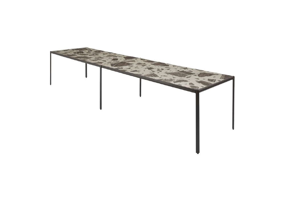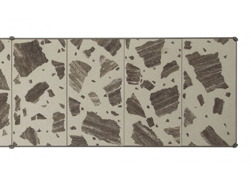 Aldìa designed by Carlo Colombo for Giorgetti is a table with Pewter painted metal structure and top available in the following versions: Palladiana, made up of fragments of different sizes of walnut travertine marble embedded in minute grit of marble dust; minute grit in tuff and limestone variants. The table is available in different sizes.