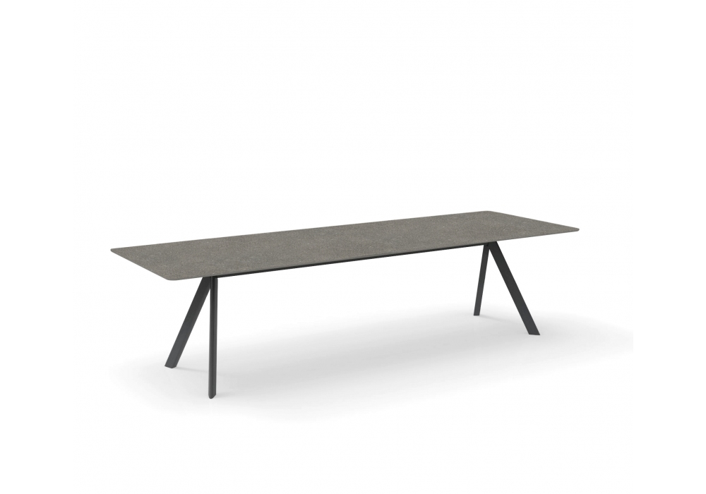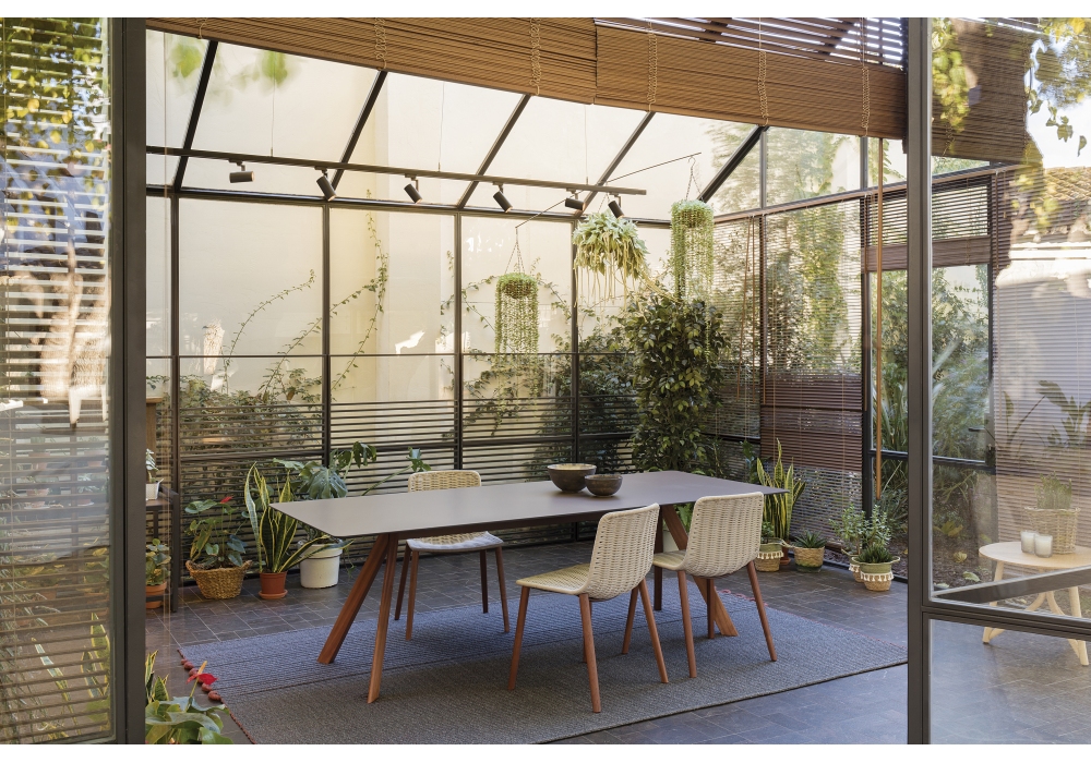 Atrivm Outdoor designed by Manel Molina for Expormim is a rectangular dining table with structure and legs made of high resistance aluminum profile, finished with polyester powder or FSC® C164846 certified sapele wood. Tabletop available in HPL or Dekton.