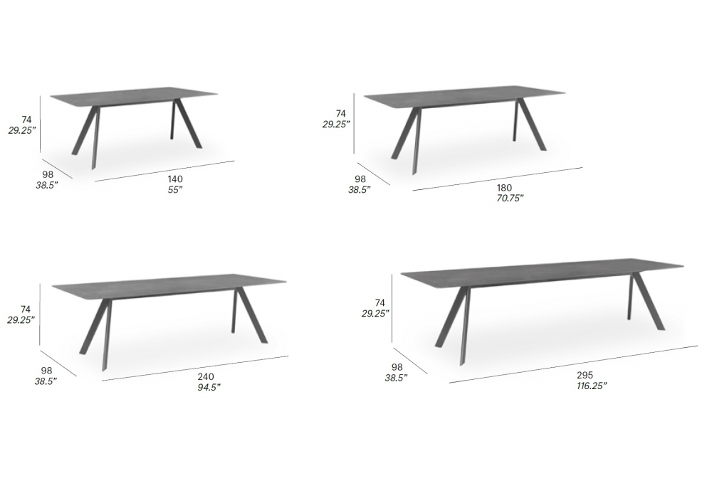| Dimensions | • 140 x 98 x H 74 cm; • 180 x 98 x H 74 cm; • 240 x 98 x H 74 cm; • 295 x 98 x H 74 cm |