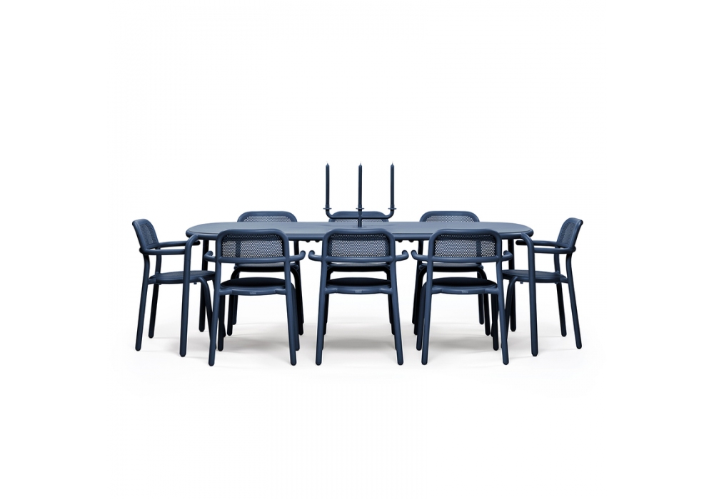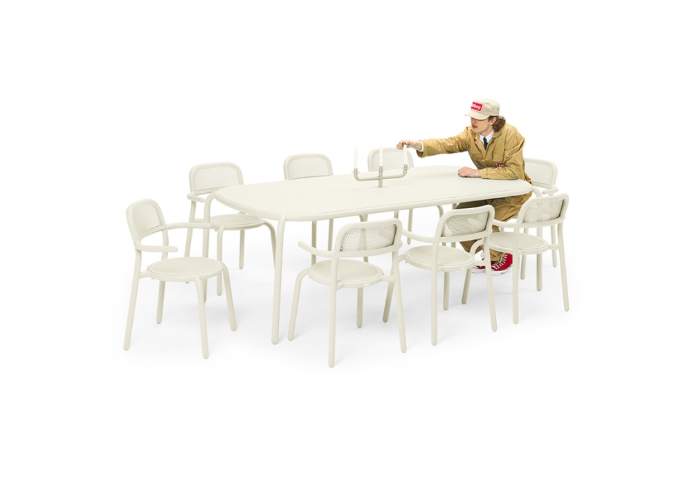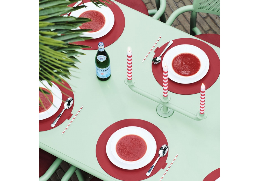 Toní Tablo designed by Erik Stehmann by Fatboy is a table that can accommodate up to 8 people. The aluminum makes the table beautiful and light, so that it can be moved easily. In the central hole can be inserted a parasol for the day and the candlestick for the evening, resistant to rust and bad weather and its color does not fade. Available in different finishes.