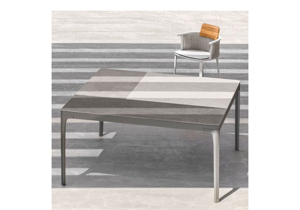 Play Square designed and produced by Ethimo is an outdoor dining table with painted aluminum structure and top in teak, aluminum or ceramic stone.