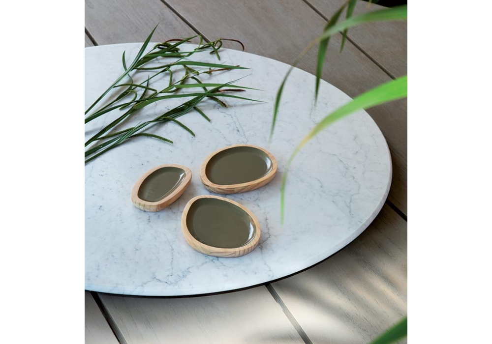 Rafael Round designed by Paola Navone for Ethimo is an outdoor dining table with teak wood structure with circular marble tray. Rafael Round is available in different finishes.