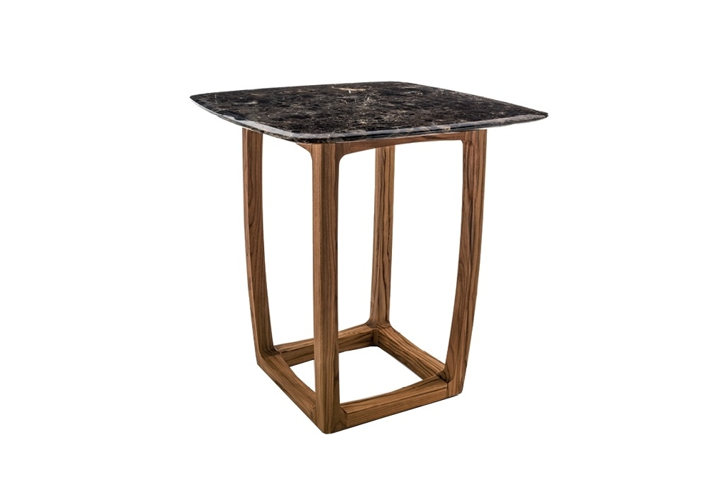 Bungalow Marble Outdoor designed by Jamie Durie for Riva 1920 is a bar table composed of a fully turned solid teak wood structure, assembled and smoothed by hand, with a square base combined with a marble top with rounded and protruding sides.