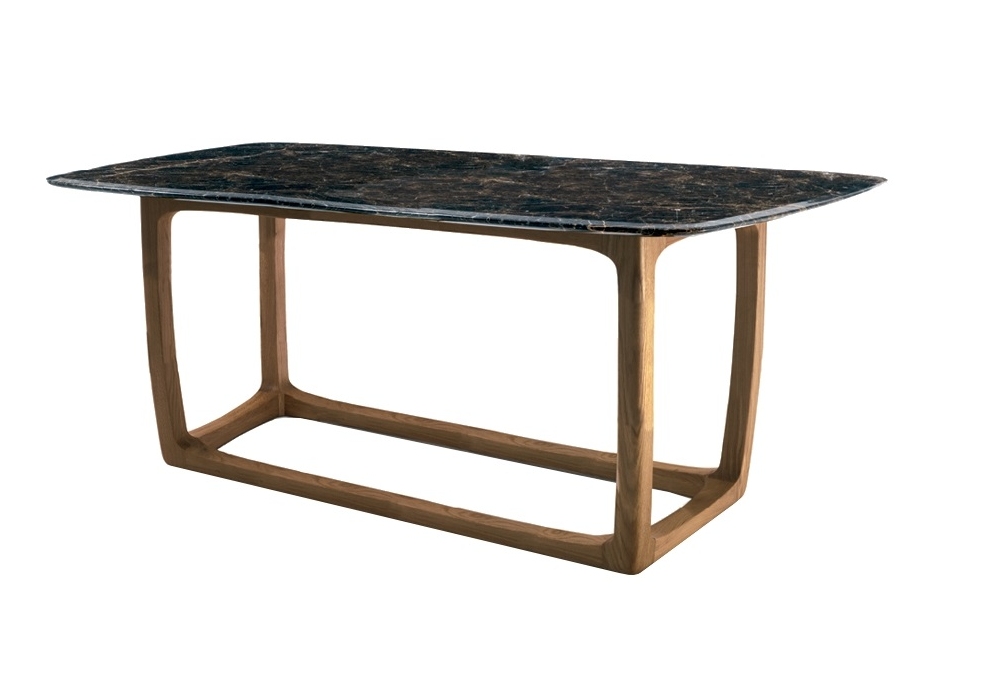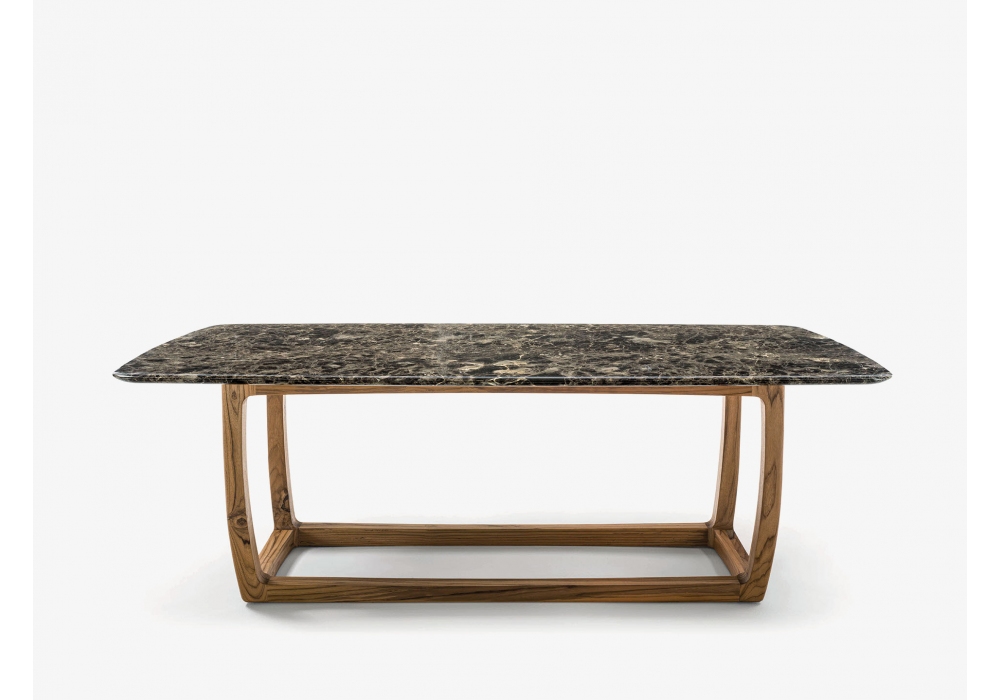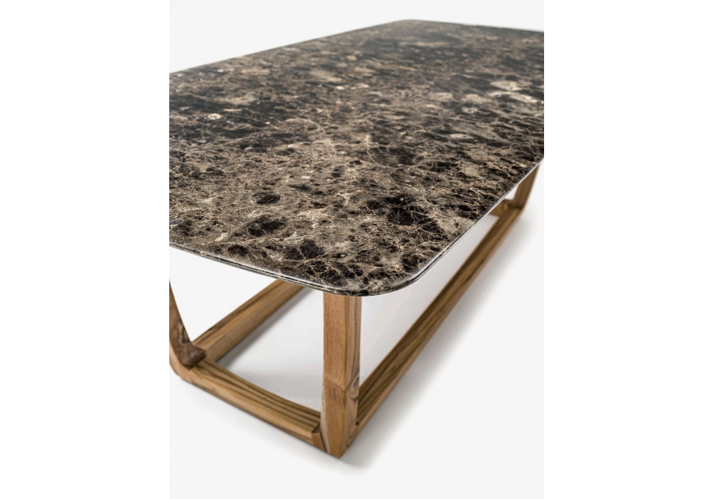 Bungalow Table Outdoor designed by Jamie Durie for Riva 1920 is a table composed of a fully turned solid teak wood structure, assembled and smoothed by hand, with a square base combined with a marble top with rounded and protruding sides.