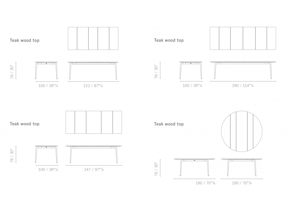 | Dimensions | 222 x 100 x H 76 cm; 247 x 100 x H 76 cm; 290 x 100 x H 76 cm; Ø 180 x H 76 cm. |