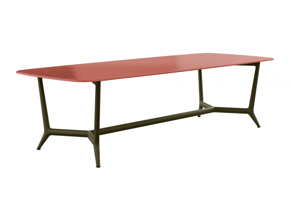 Erica designed by Antonio Citterio for B&B Italia Outdoor is an outdoor table with a painted aluminum structure in various finishes and a back-painted fused glass top.