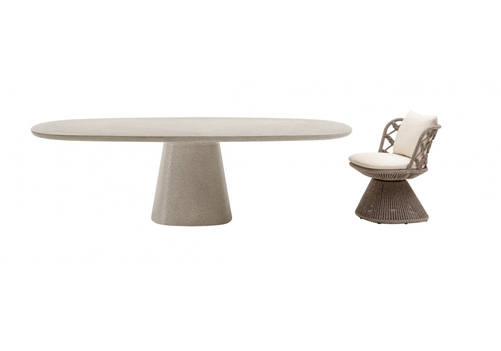 Allure O' designed by Monica Armani for B&B Italia Outdoor is a table made of concrete in a gray or milky white finish. The surface of the table top is treated with an impregnating product that leaves the material permeable to air but protects it from water and grease. The product is resistant to UV rays and abrasion and prevents degradation due to frost/thaw.