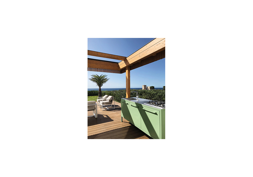 Frame Outdoor designed by Salvatore Indriolo for Fantin is a counter / kitchen available for outdoor thanks to a cataphoresis treatment that prevents the formation of rust. Composed of stainless steel top and structure available in different finishes. Possibility of adding accessories and different configurations.