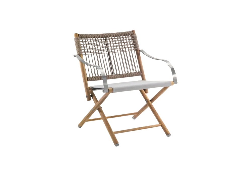 Lauren Outdoor designed by Antonio Citterio for Flexform is a small armchair with folding structure in solid iroko wood, braided backrest in matt polypropylene cord and metal parts in burnished, matt brushed or matt titanium 710 finishes. Seat in removable water-repellent and stain-resistant canvas in the color Dunes 9720.