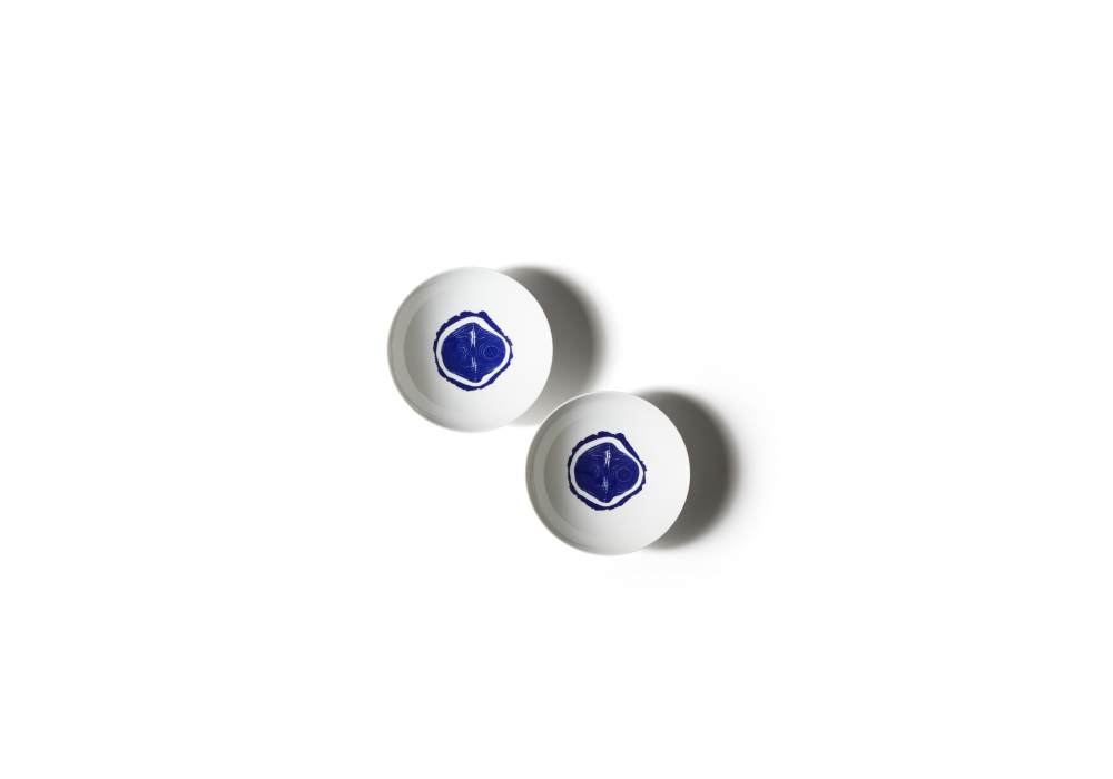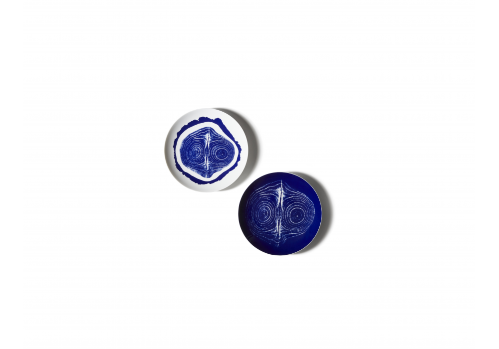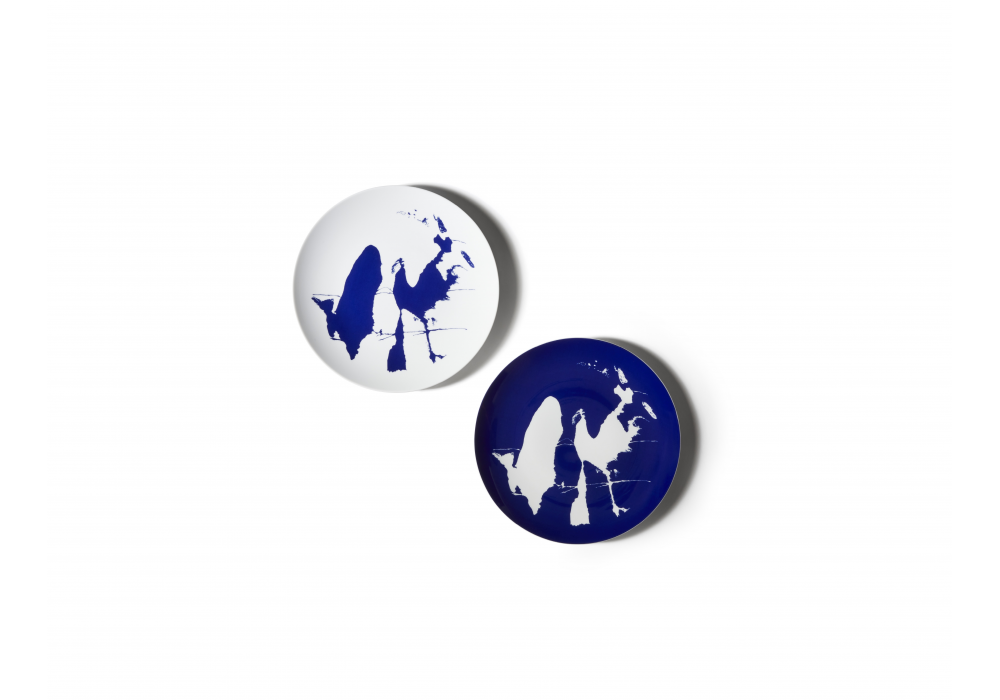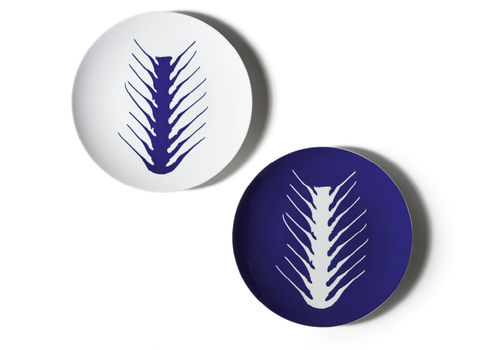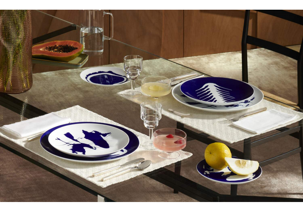 Le Monde de Charlotte Perriand designed by Charlotte Perriand for Cassina is a set of dessert plates, flat plates or soup plates or placeholder plate. Each set contains a white plate and a blue plate. Available with different designs.