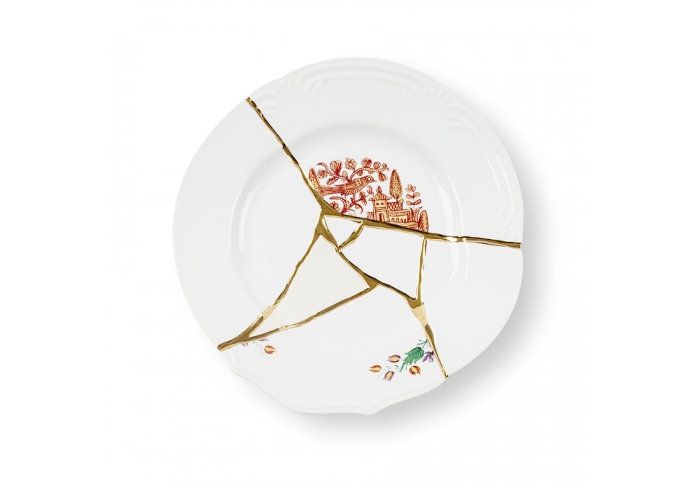 Kintsugi designed by Marcantonio for Seletti is a white porcelain dinner plate decorated with various pigments. Kntsugi is available in different models.