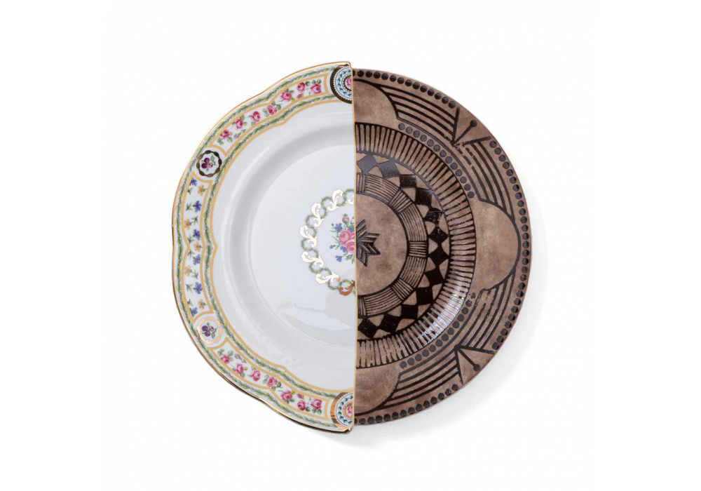 Hybrid Hobyo designed by CTRLZAK for Seletti is a porcelain dinner plate decorated with various figures and pigments.