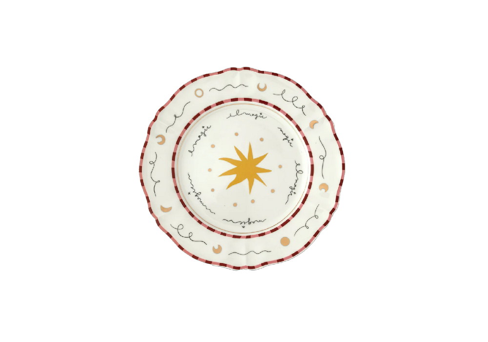 Stella signed by design Pangea for Bitossi Home is a dinner plate made of porcelain with gold decal and details. Suitable for dishwasher and a maximum of 250 washes. Not suitable for microwave.