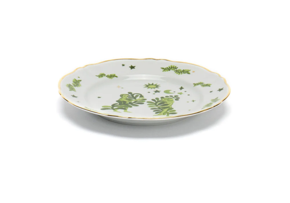 Eden signed by design Aitch.Ro for Bitossi Home is a dinner plate made of porcelain with gold decal and details. Suitable for dishwasher and a maximum of 250 washes. Not suitable for microwave.
