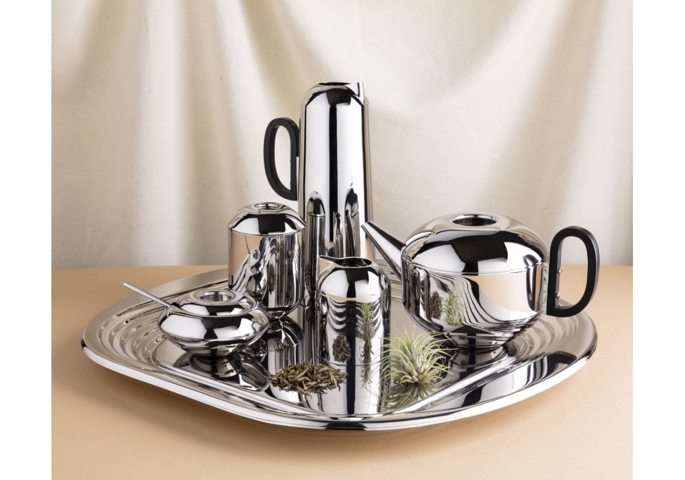 Form designed by Tom Dixon is a jug made of stainless steel in a shiny silver finish.