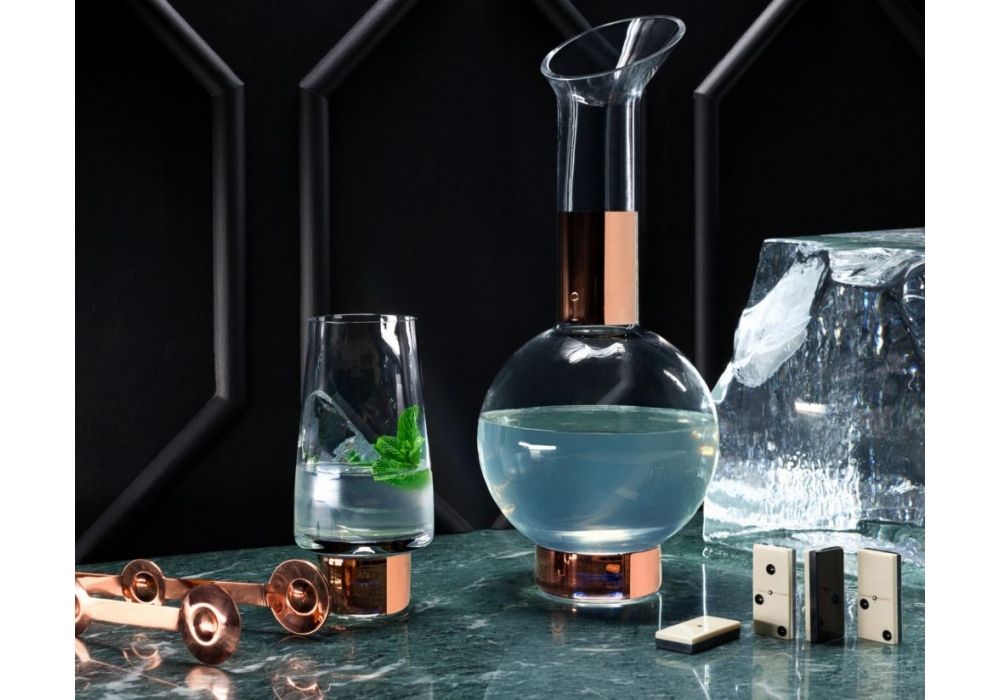 Tank designed by Tom Dixon is a carafe made of transparent blown glass, decorated with details available in copper or black finishes.